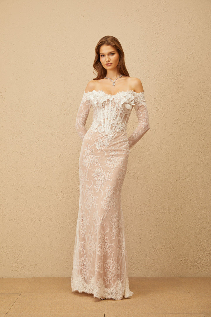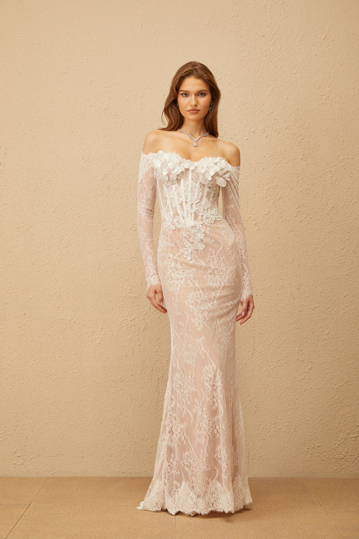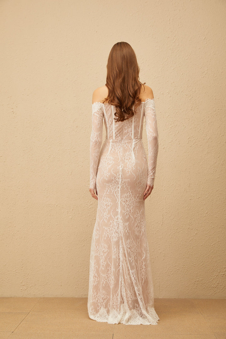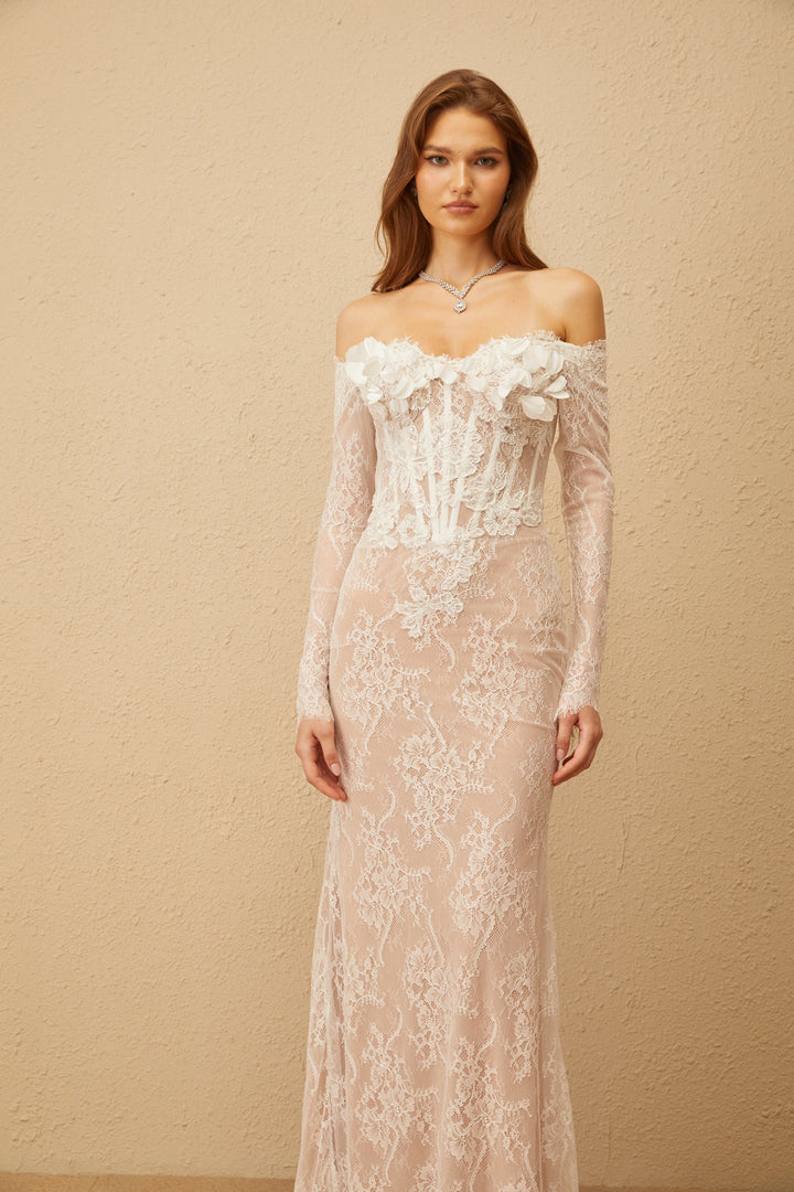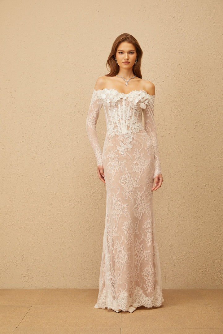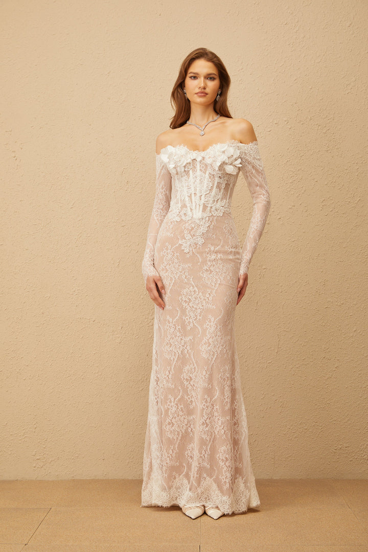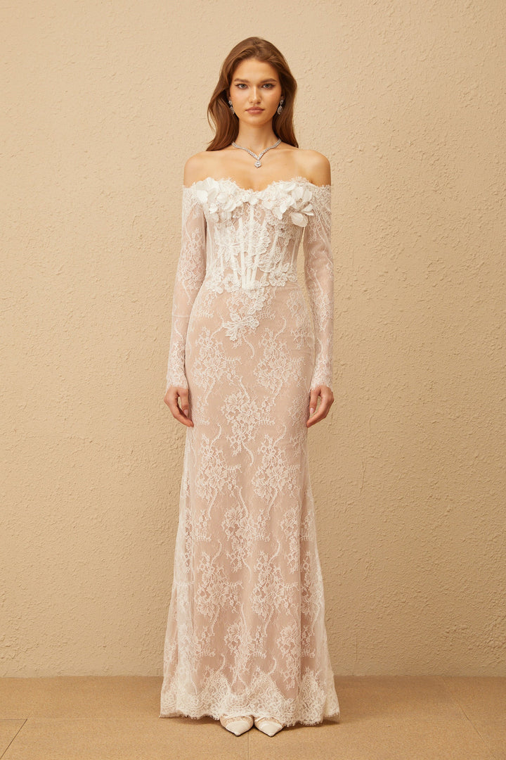 Carmen White Embellished Floral Lace Maxi Dress