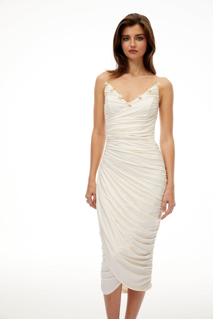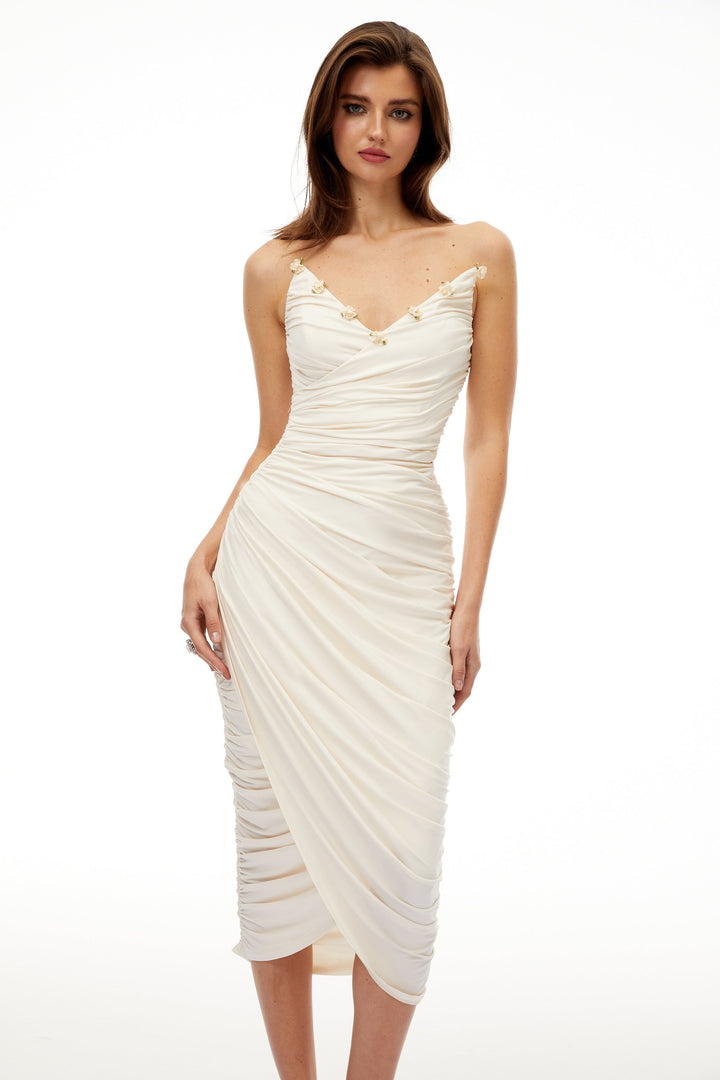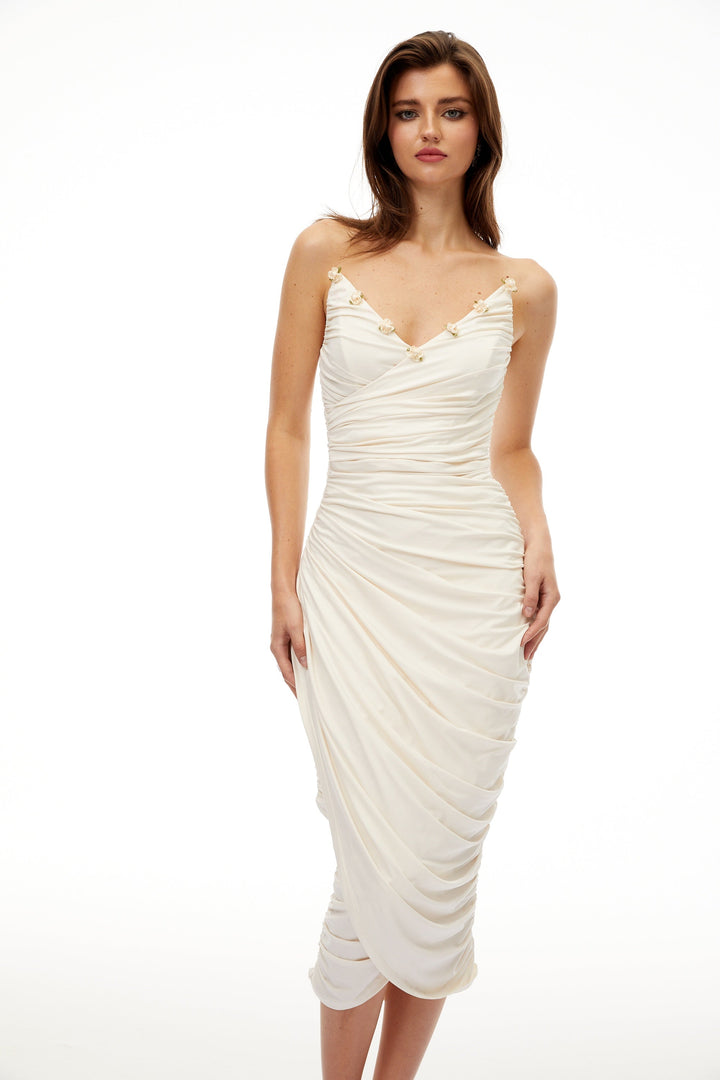 Geneviève White Floral Gathered Midi Bodycon Dress