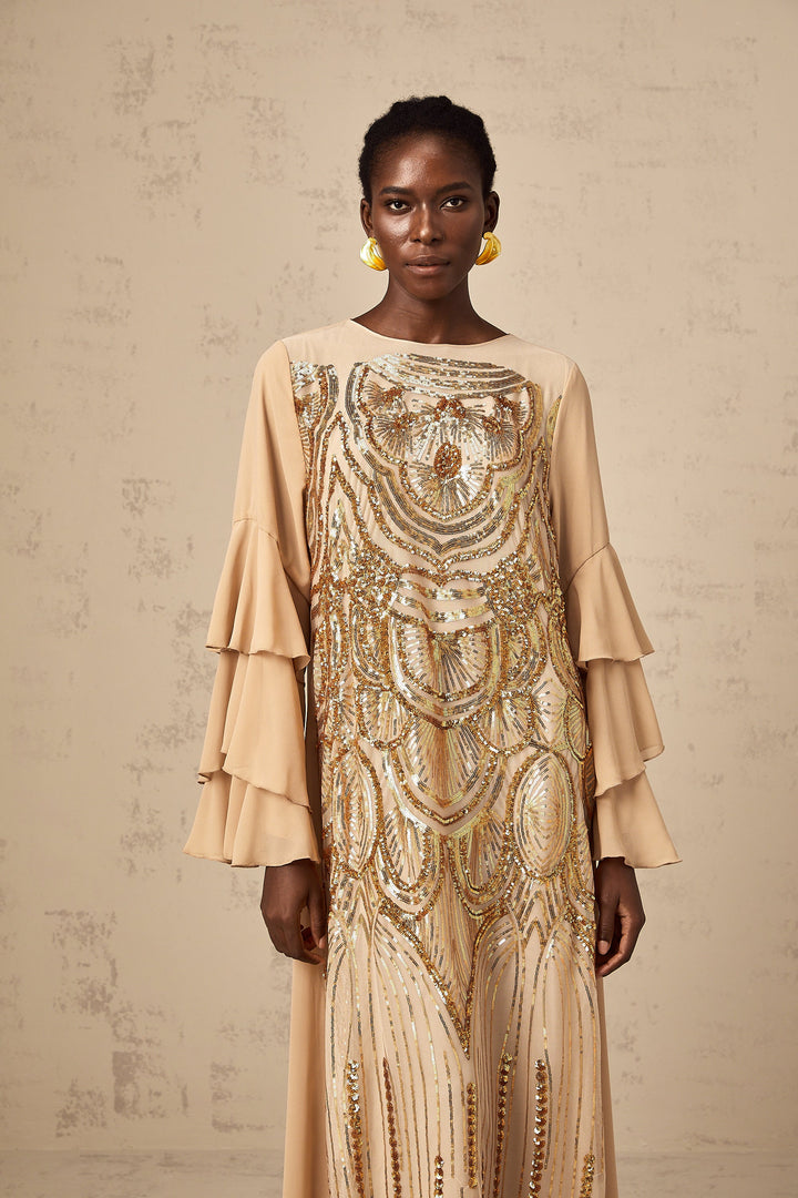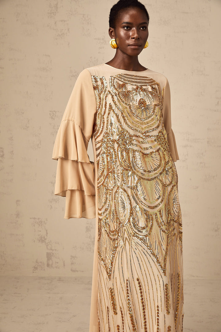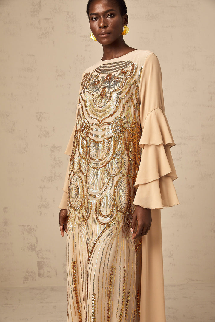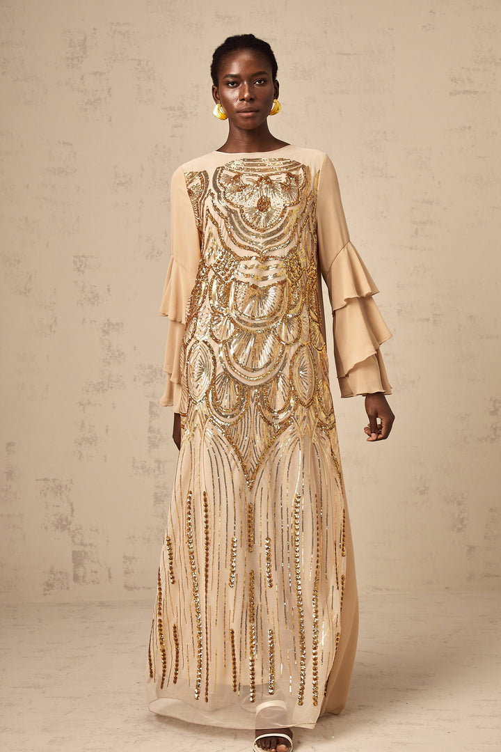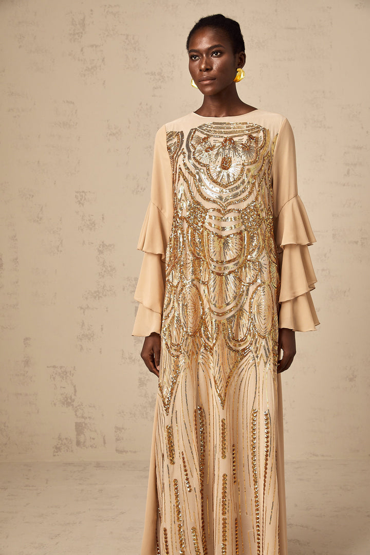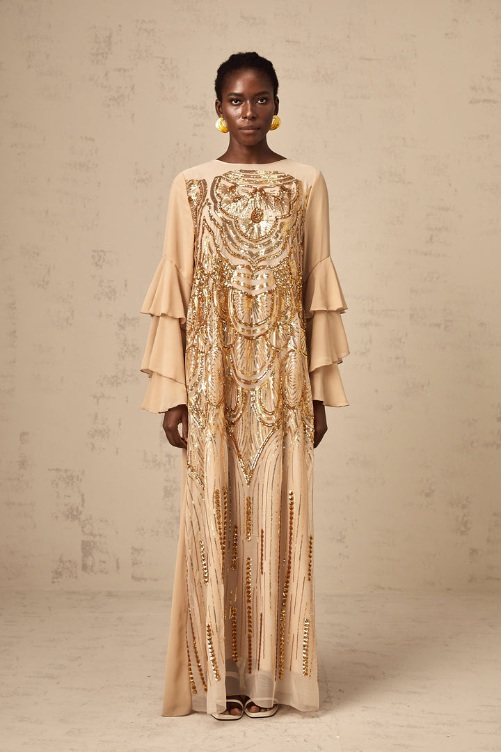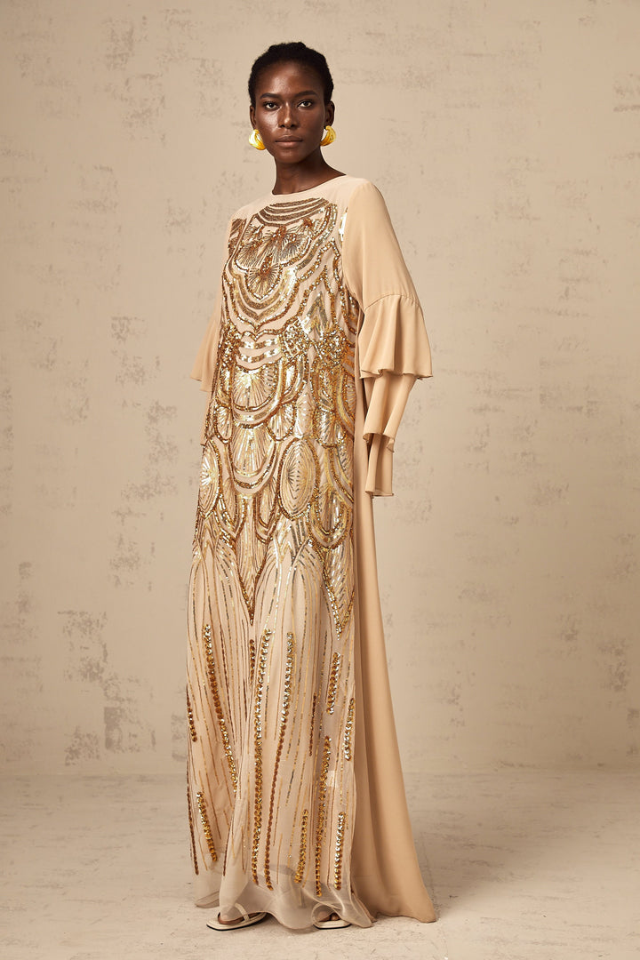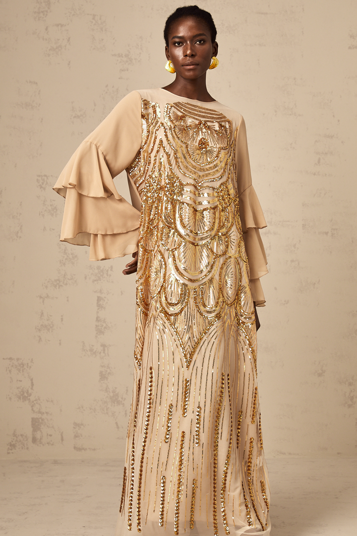 Noemi ruffle-sleeved sequined tulle maxi dress