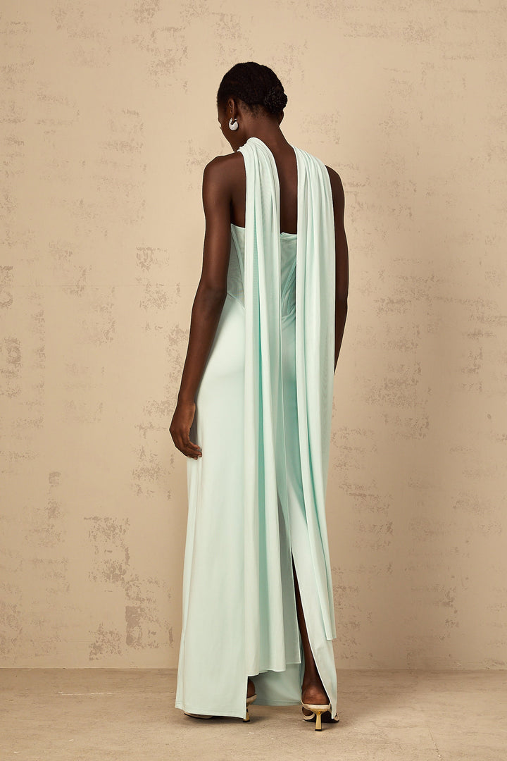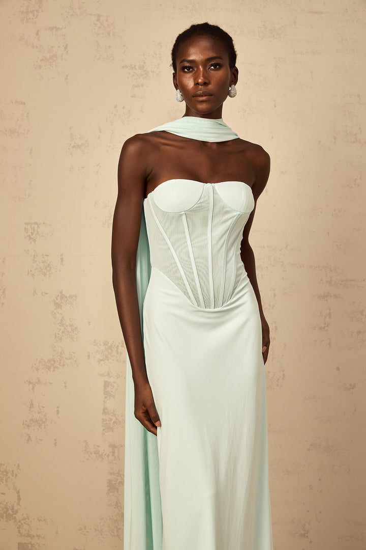 Béryl Tulle Panel Corset Maxi Dress in Mint Green