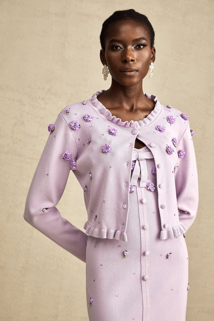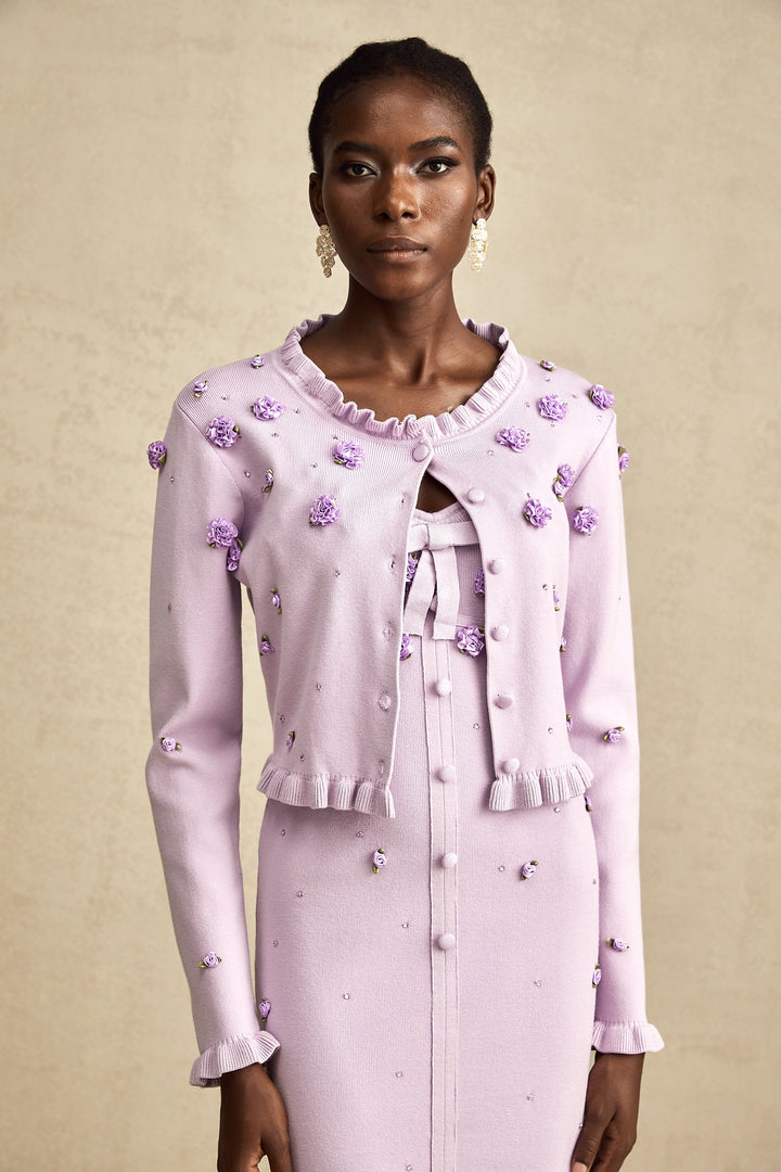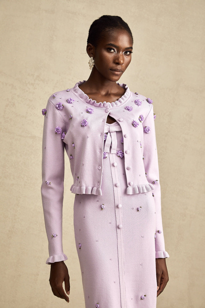 Estelle purple faux-flower knitted cardigan & dress matching set