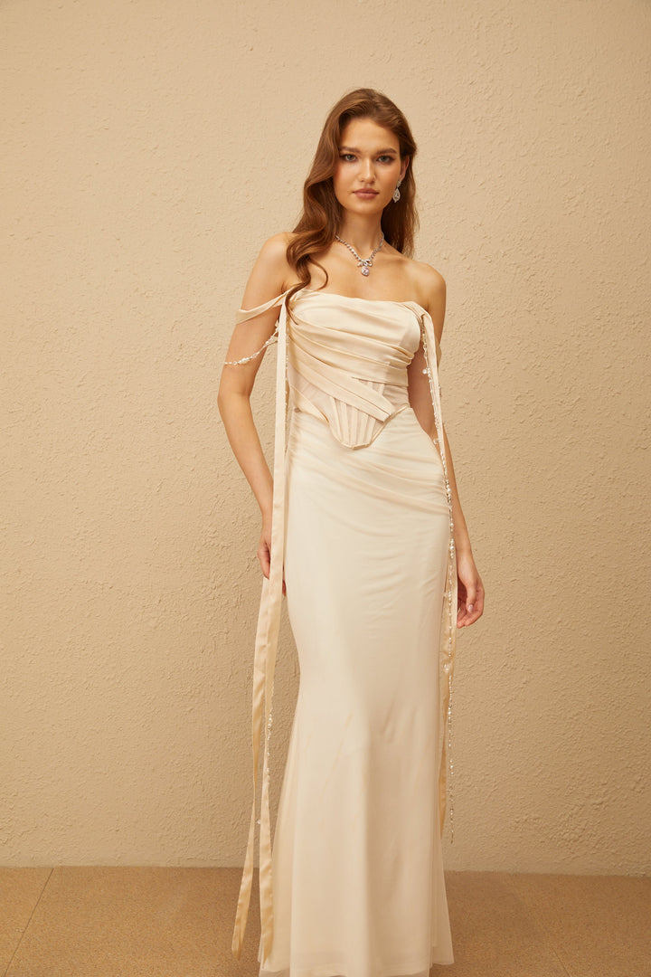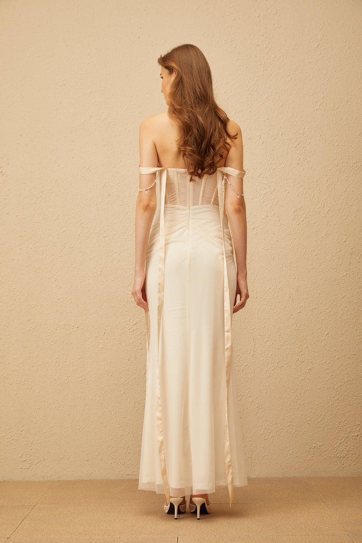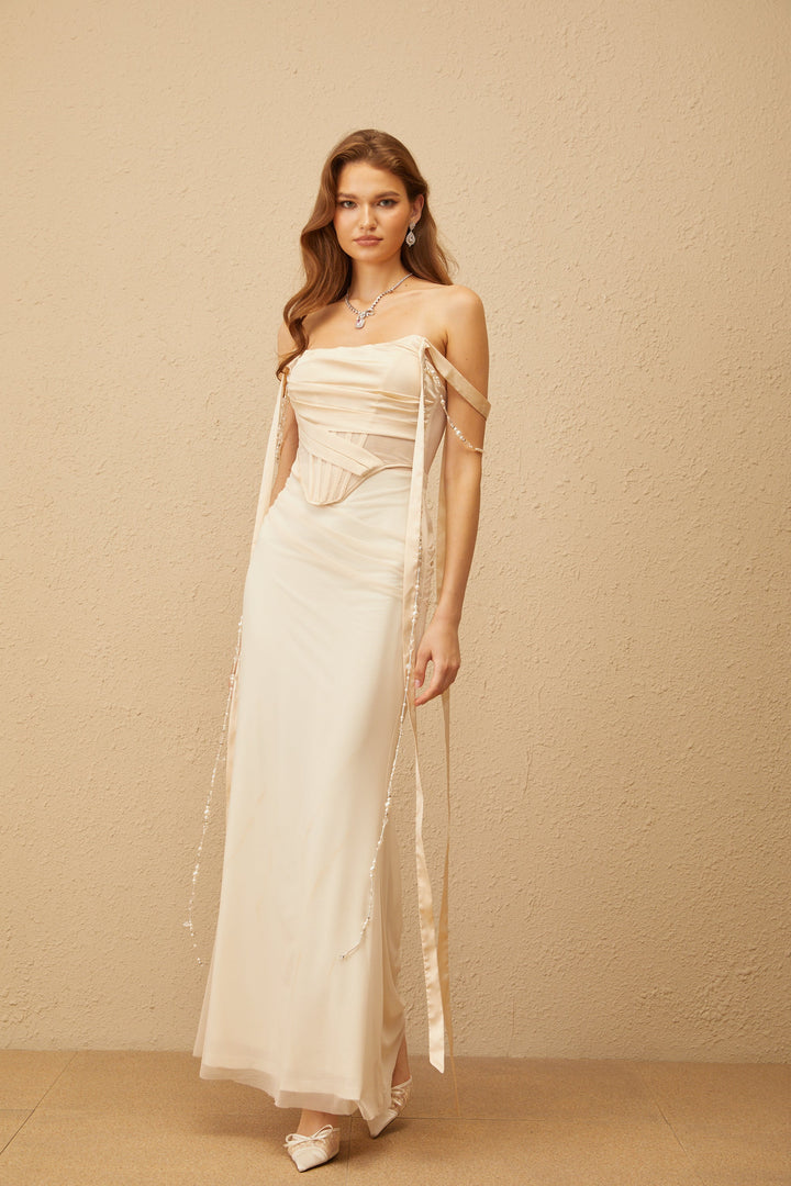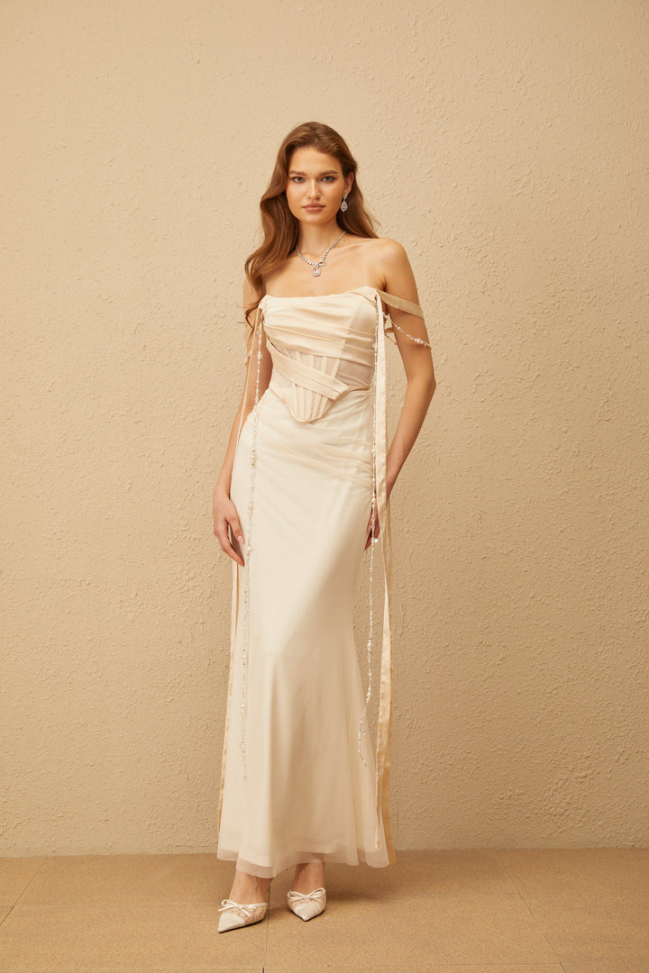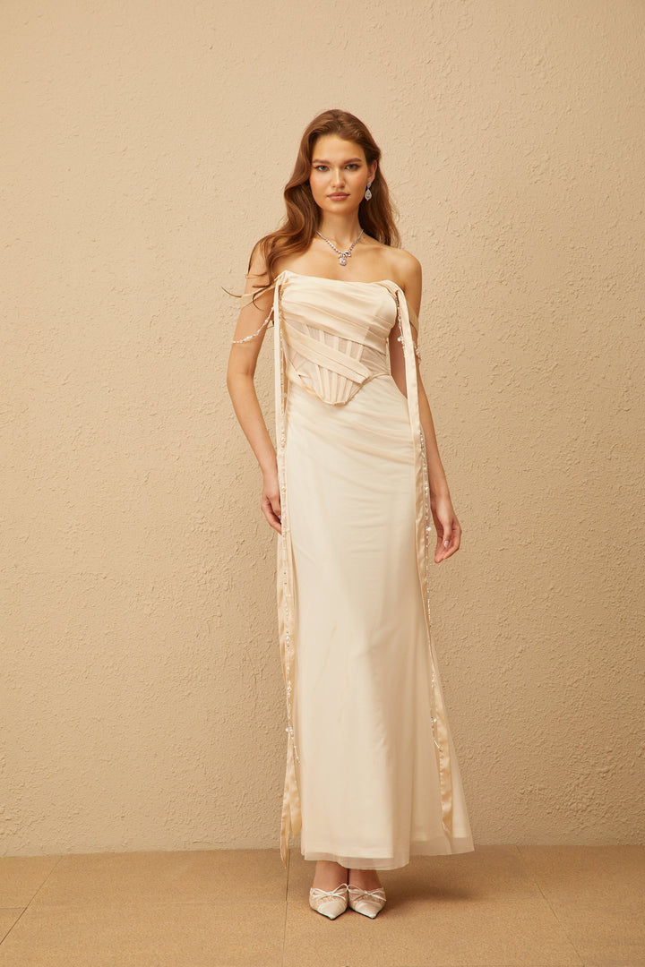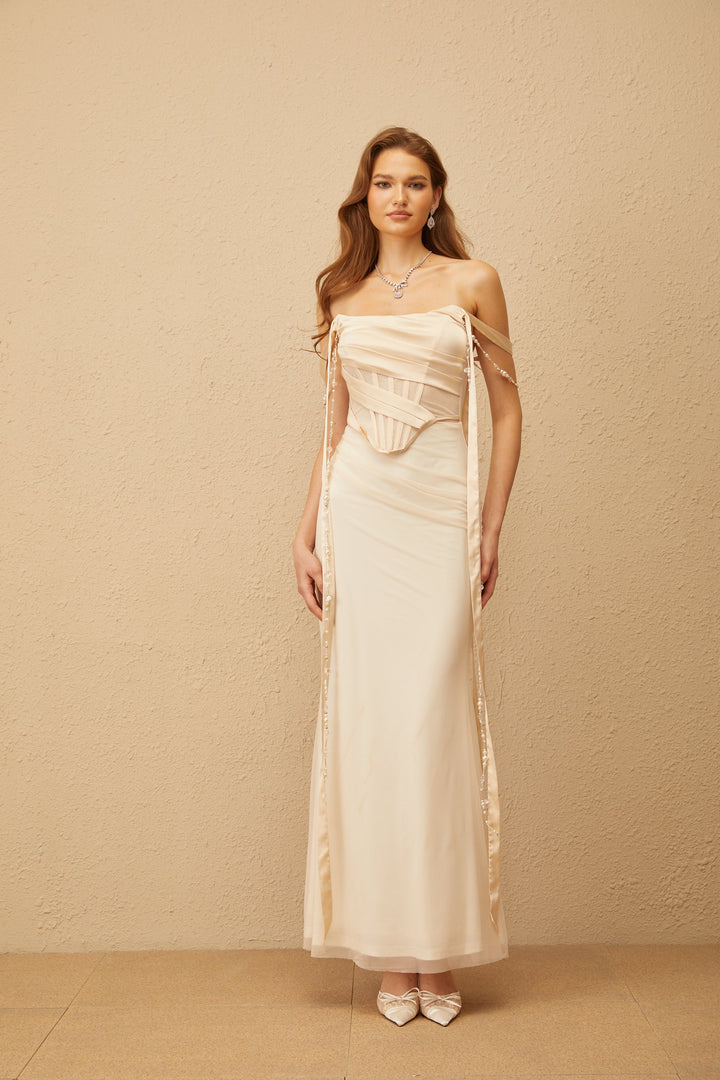Lorraine Neutral Ruched Mesh Corset Maxi Dress
