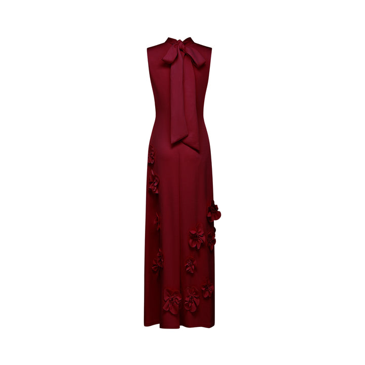 Magali Red Sleeveless Maxi Dress with Faux Flower & Bow-Tie Embellishment