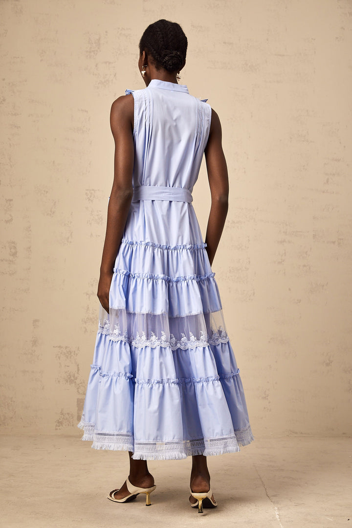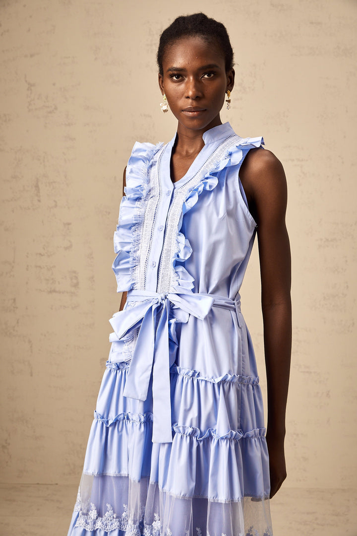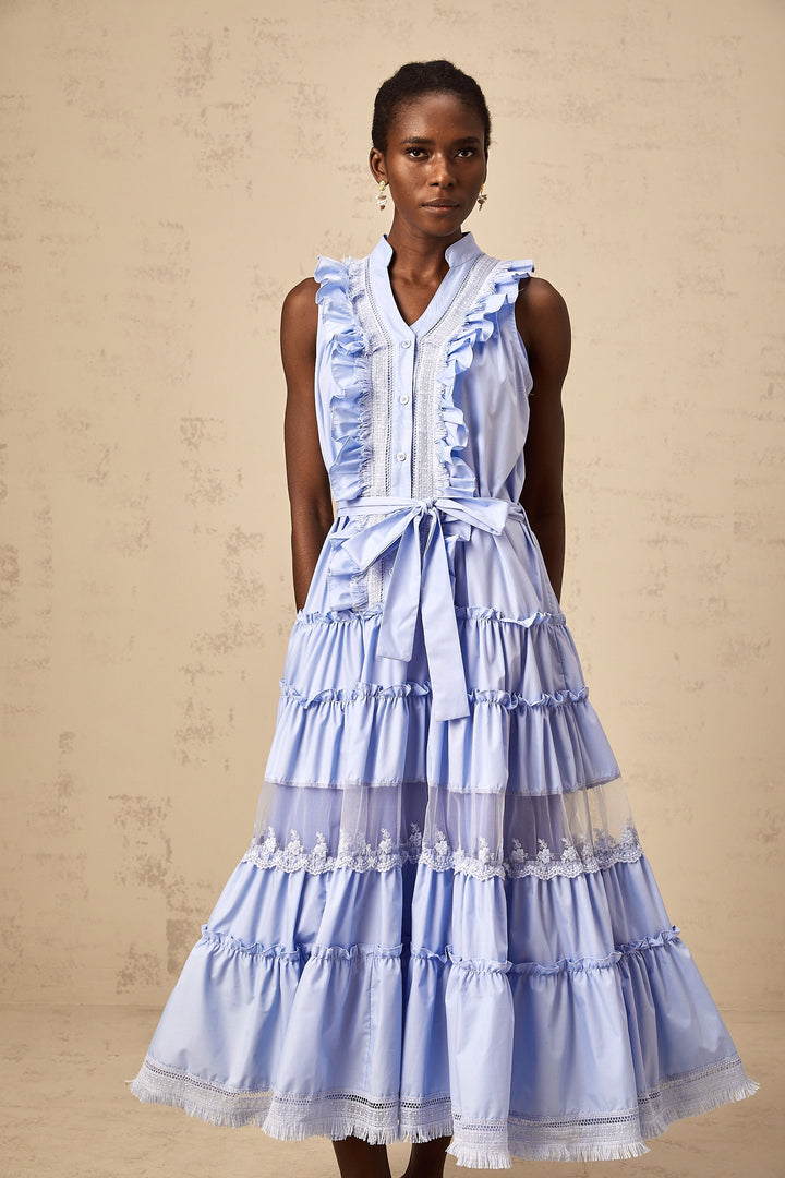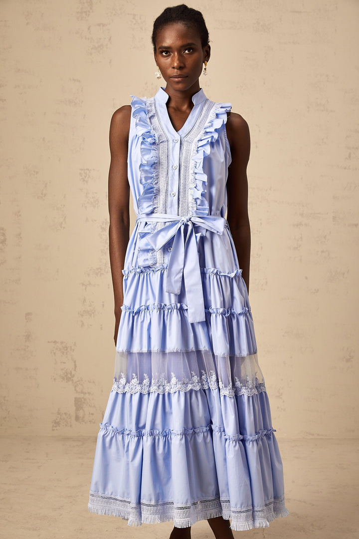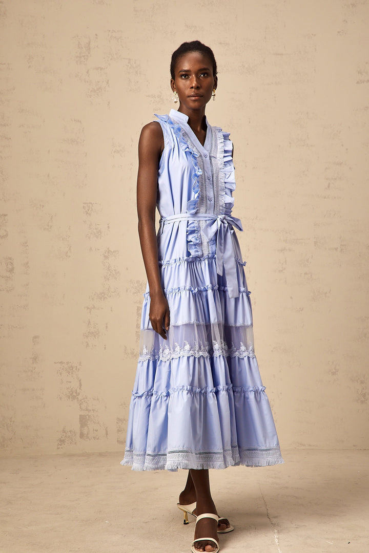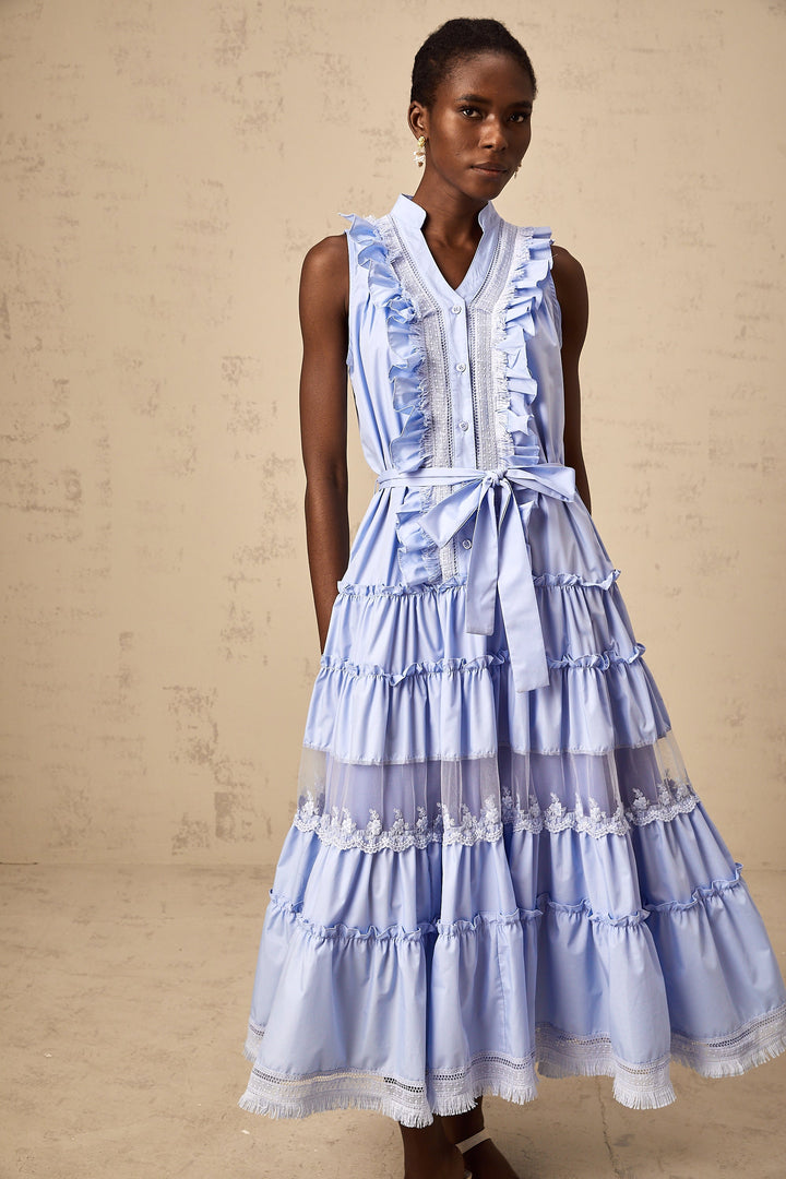 Olena blue ruffled floral-lace trimmed tiered midi dress