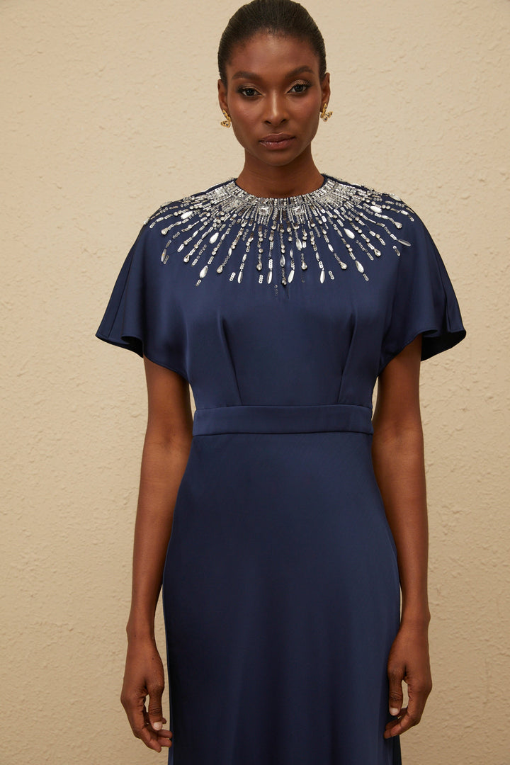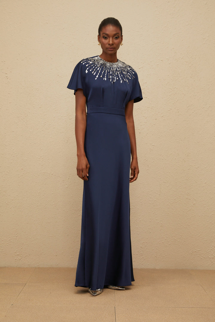 Ombrage Blue Embellished Satin Maxi Dress