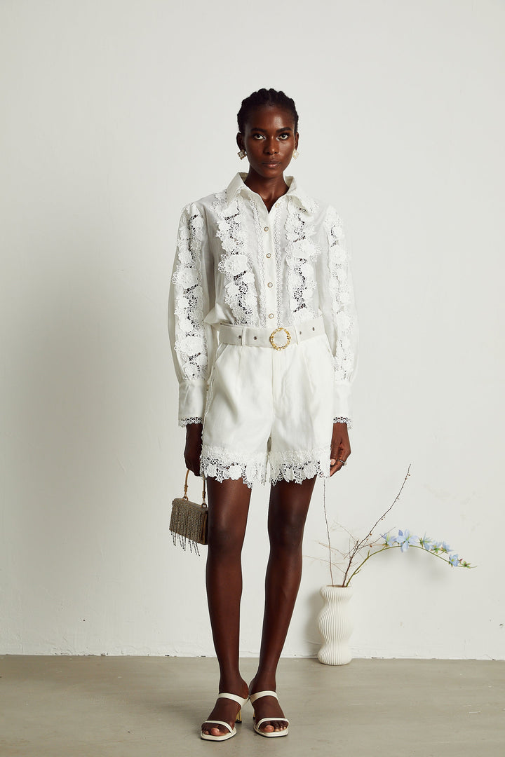 Rosalie lace-trim embroidered shirt & shorts matching set