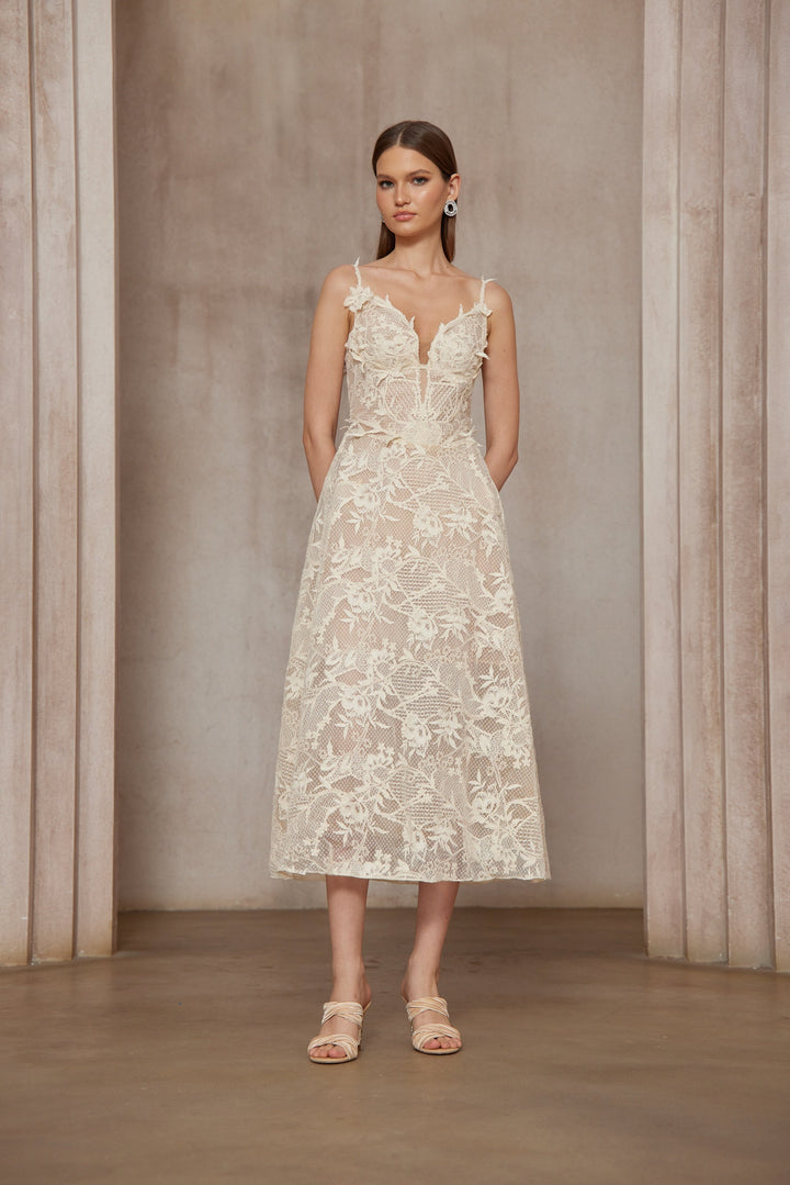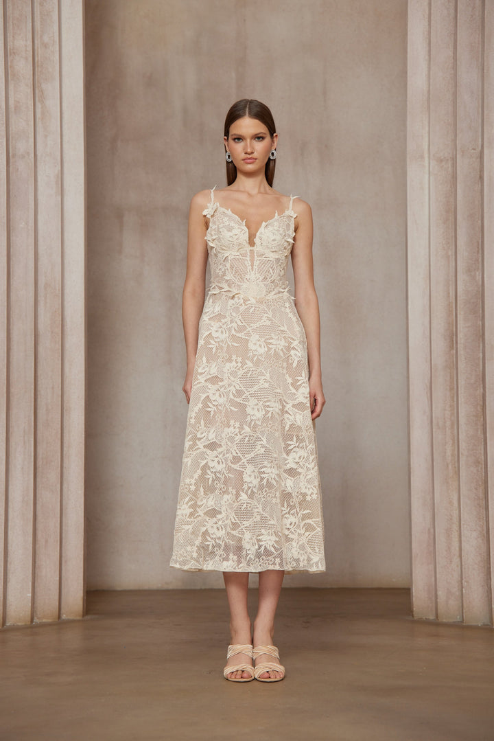 Amber White Sleeveless Floral Lace Midi Dress