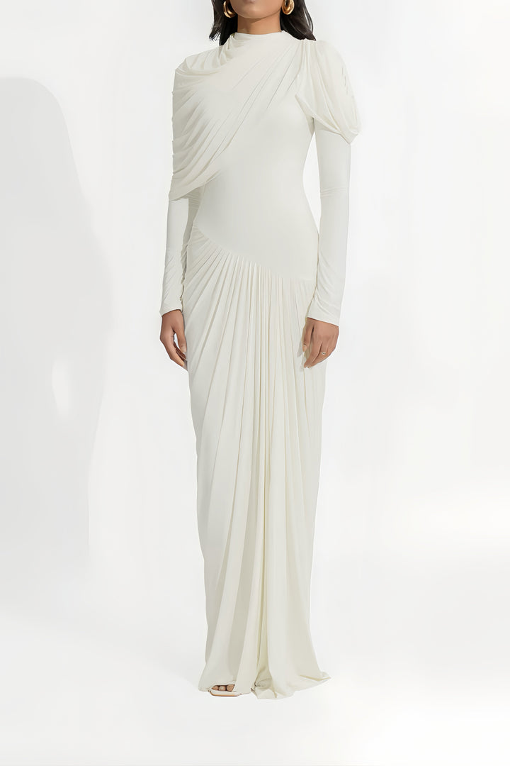 Bronwyn White Draped Pleated Asymmetrical Maxi Dress