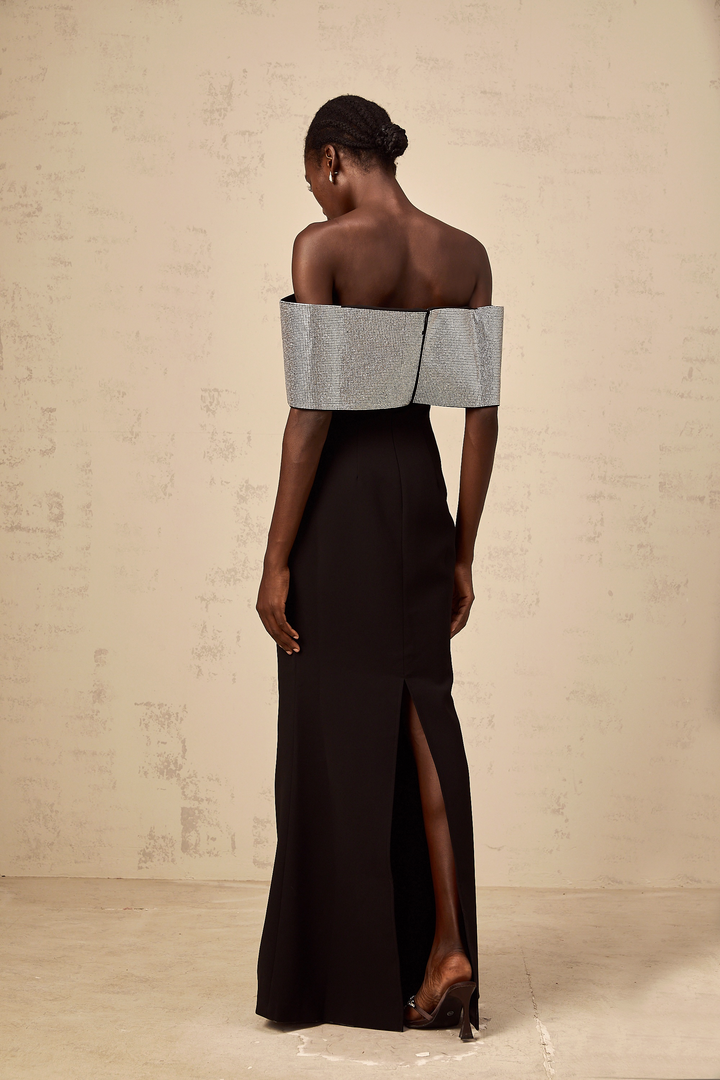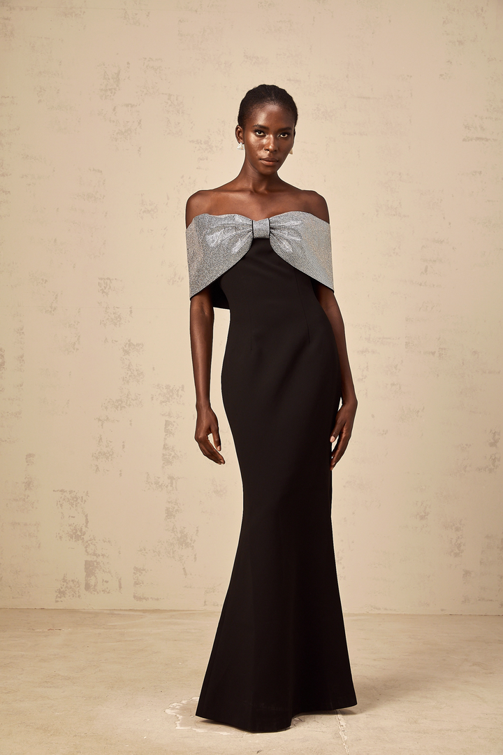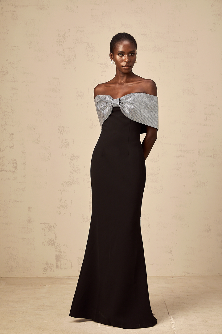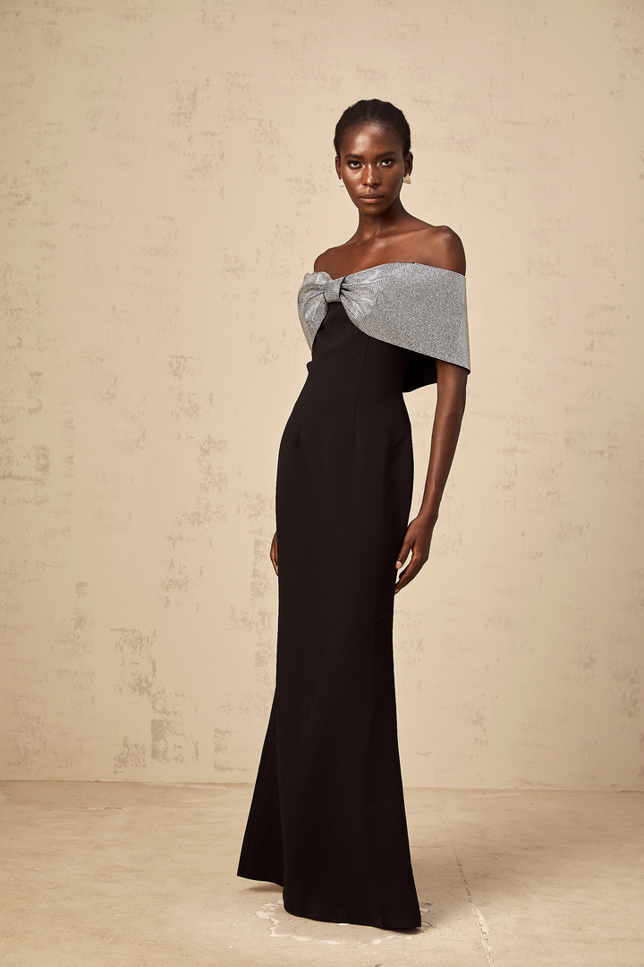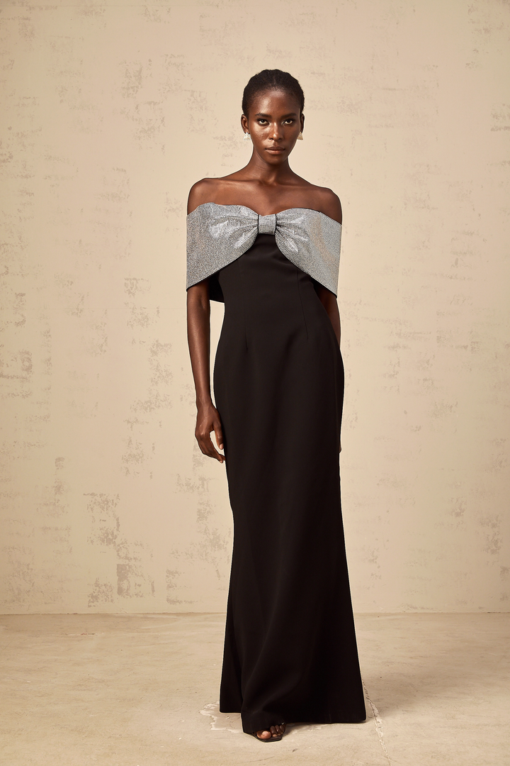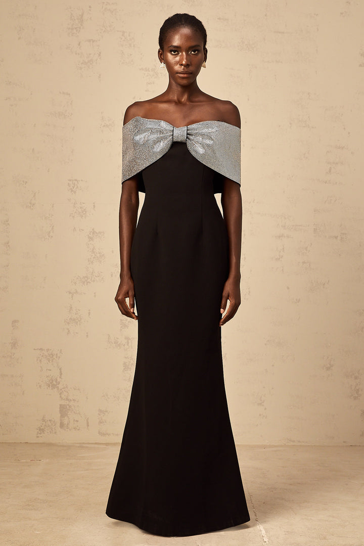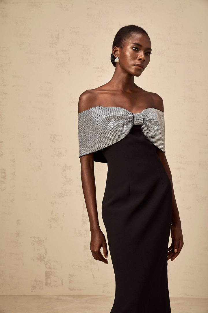 Chloé black rhinestone-bow off-shoulder maxi dress