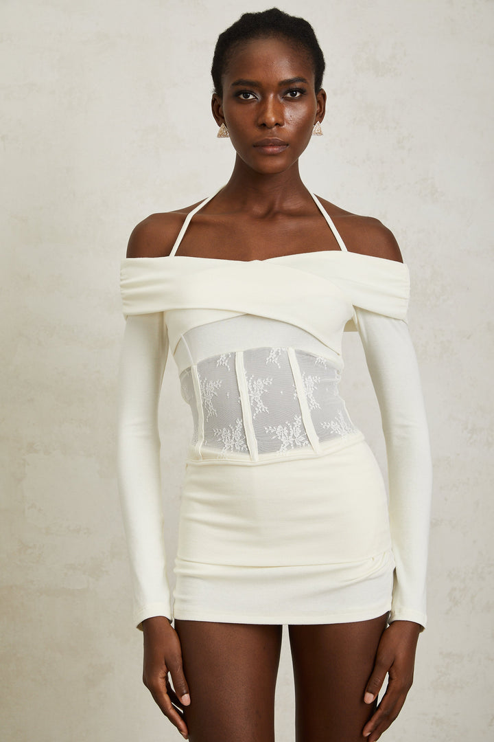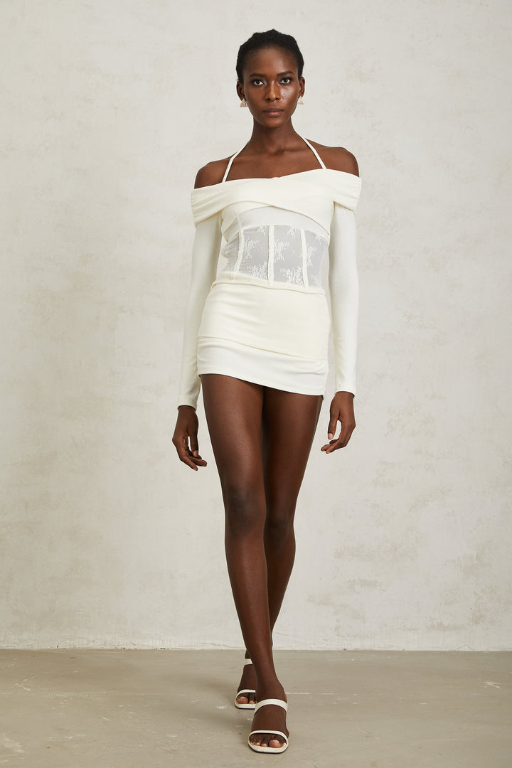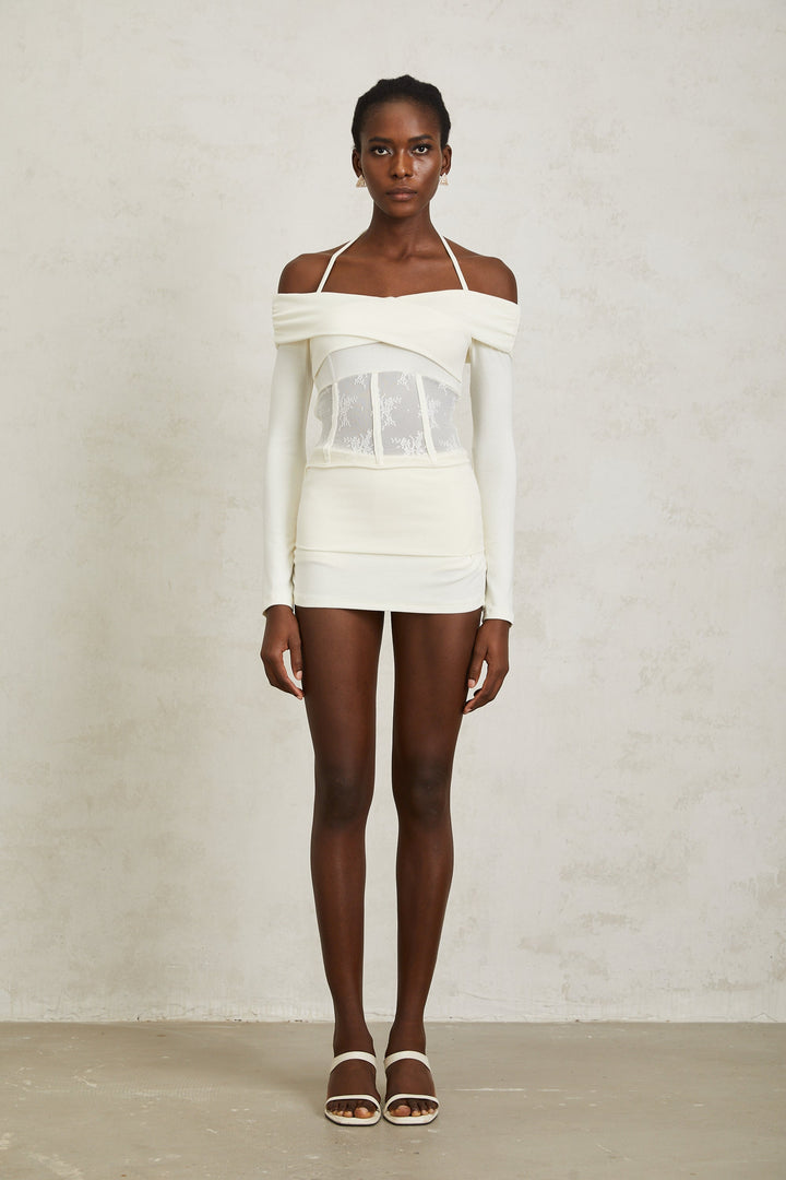 Coralie White Lace Panel Knit Blouse & Skirt Set