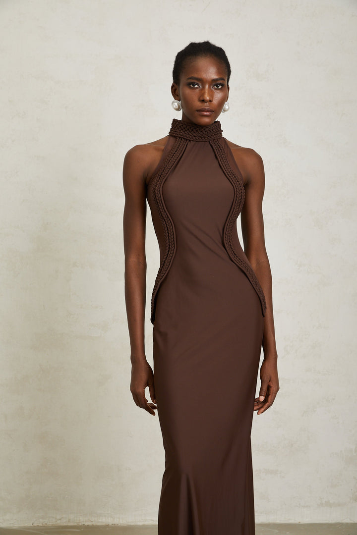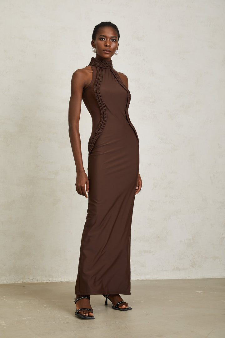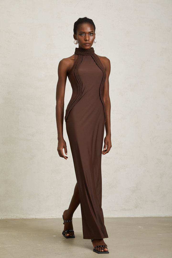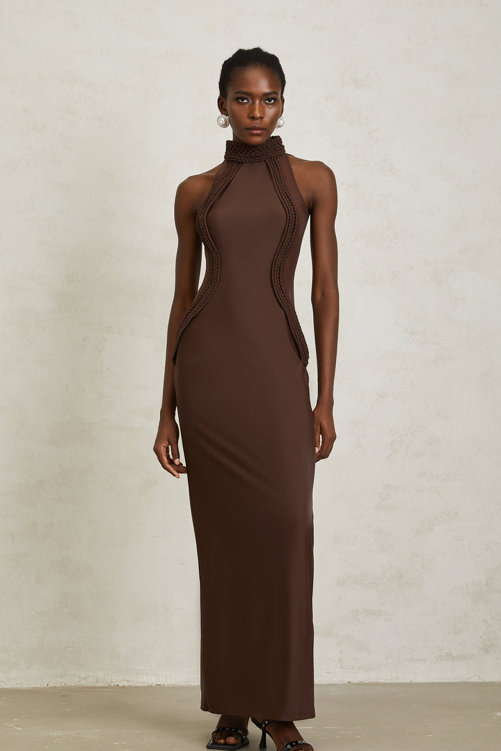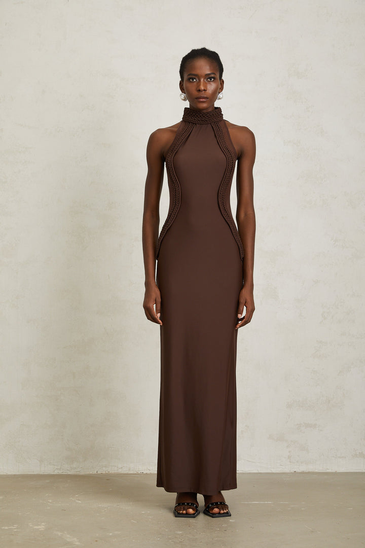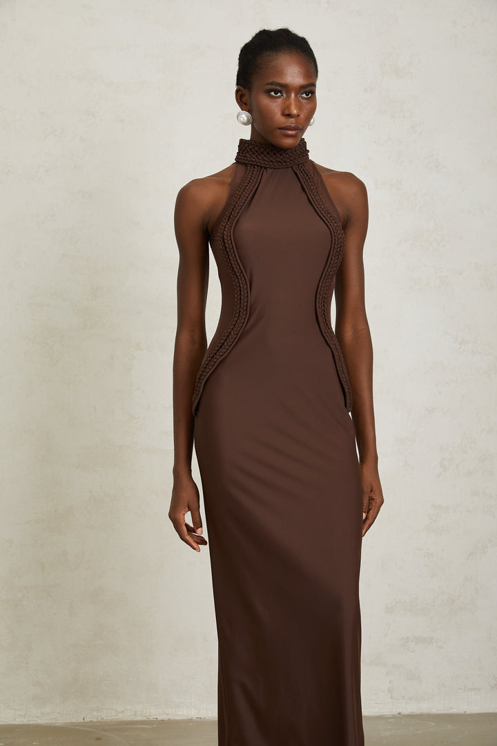 Gabriela Brown Halterneck Braid Detail Maxi Dress