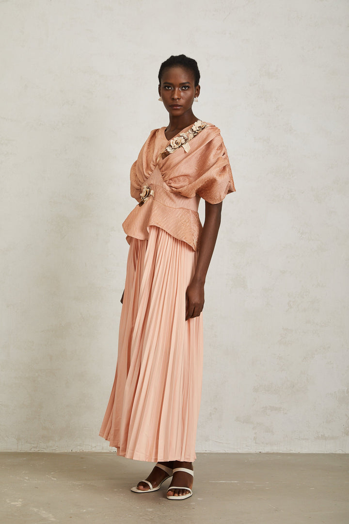Camille Pink Floral Appliqué Pleated Maxi Dress