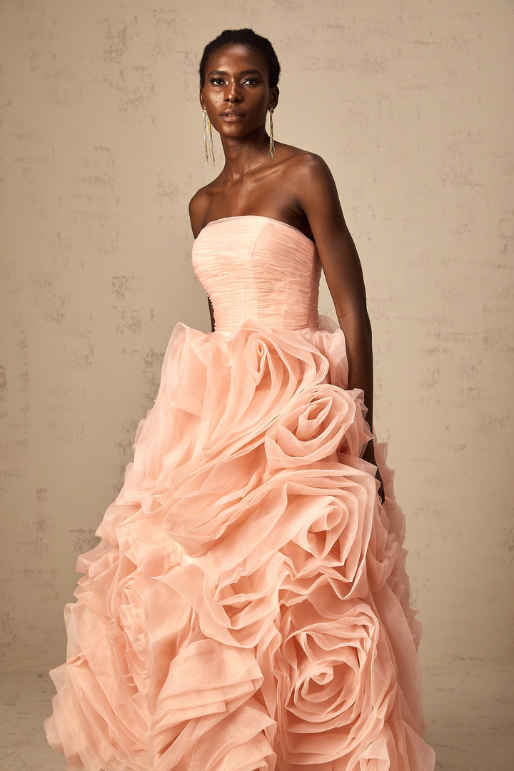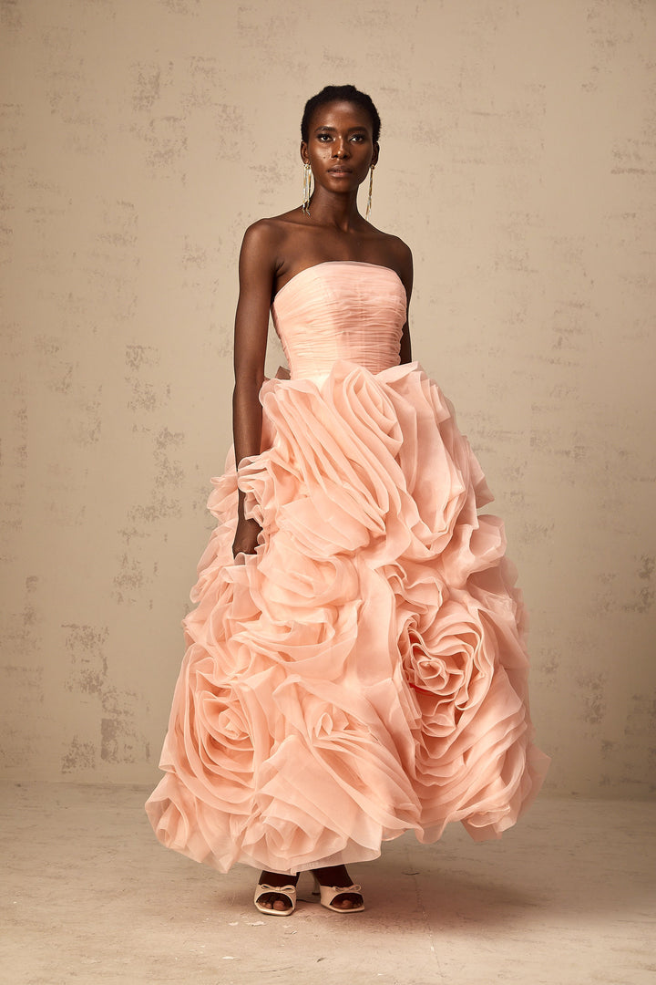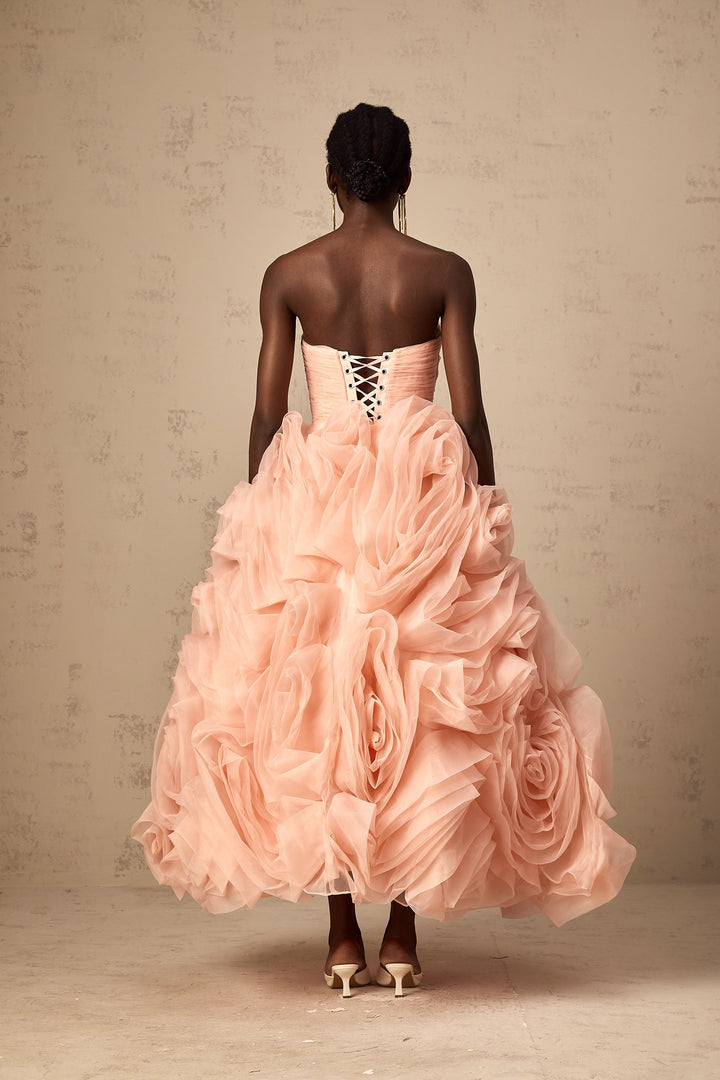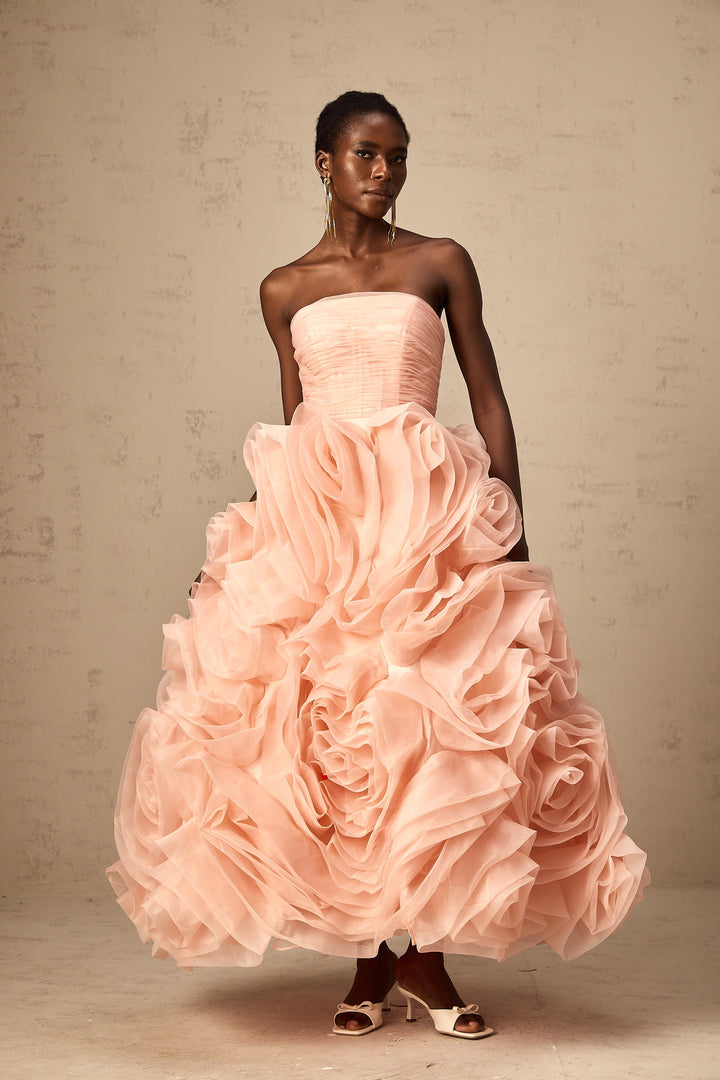 Leane Pink Off-Shoulder Tulle Midi Dress with 3D Petal Detail