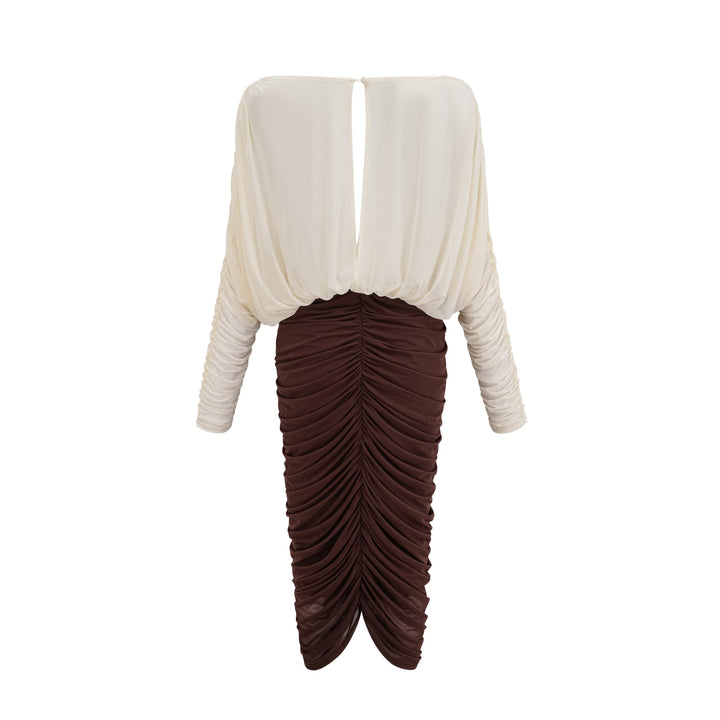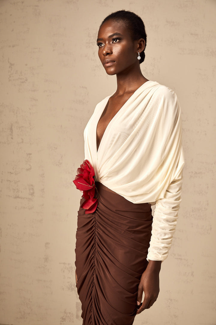 Léontine color-blocked flower-brooch ruched midi dress