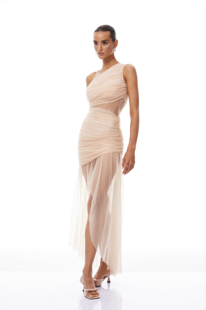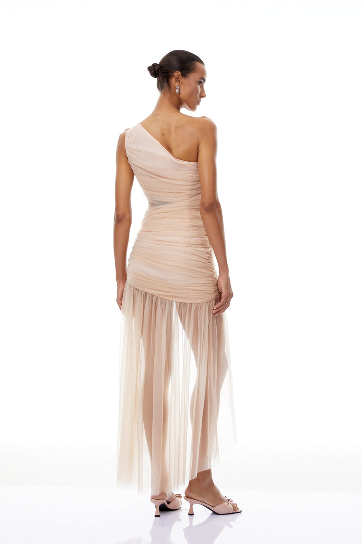 Niki Neutral Asymmetrical Ruched Tulle Midi Dress
