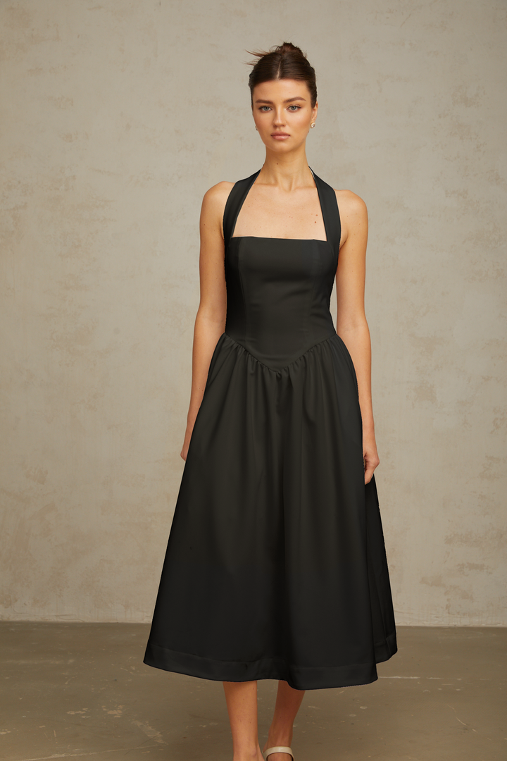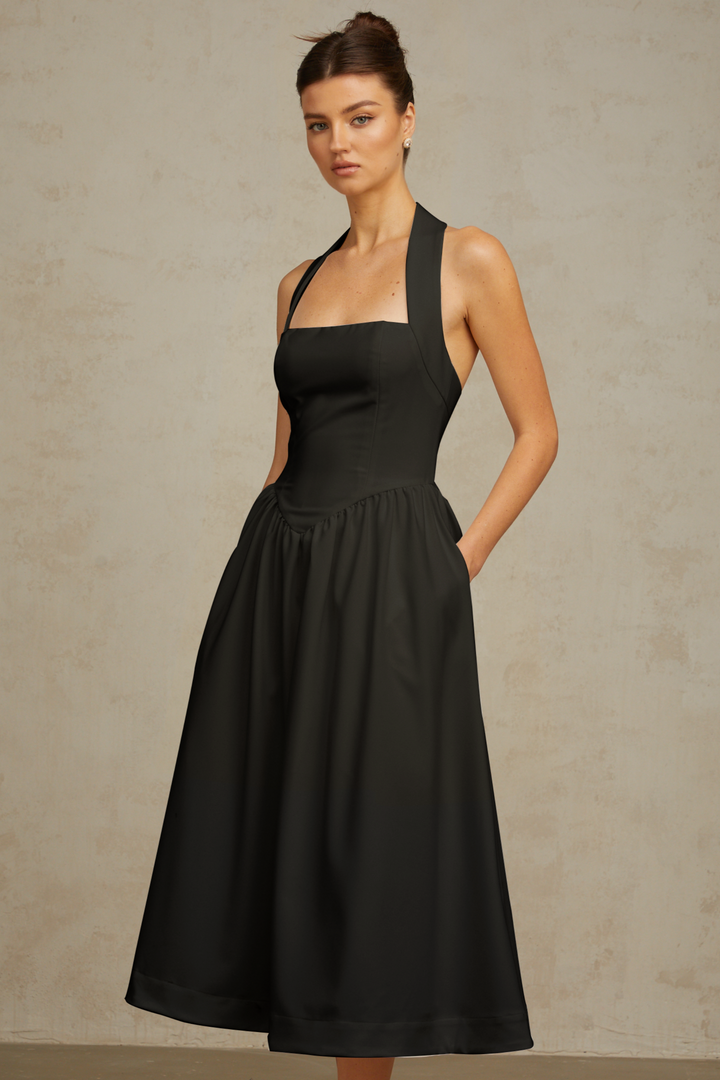 Alizée halterneck pleated midi dress in Black