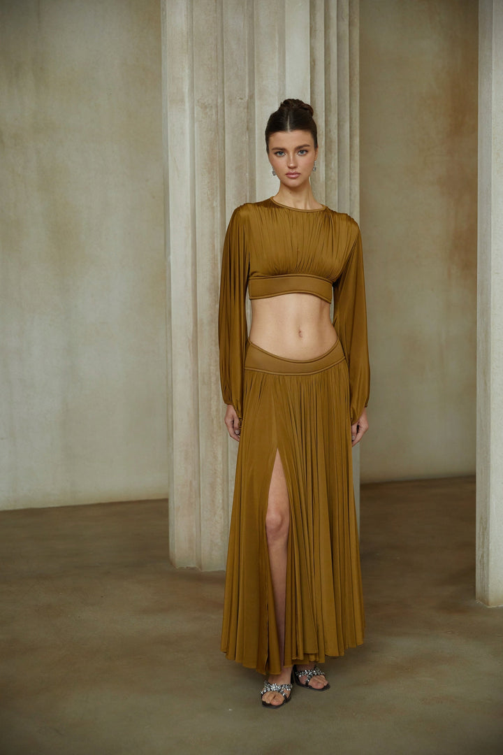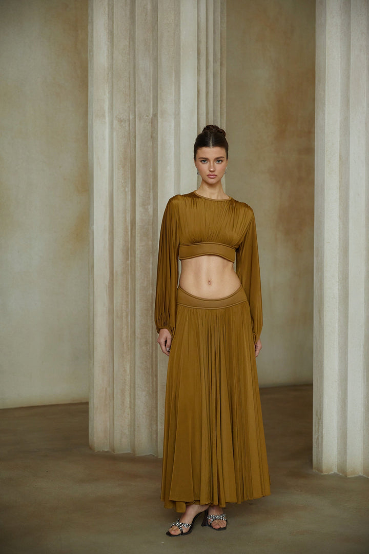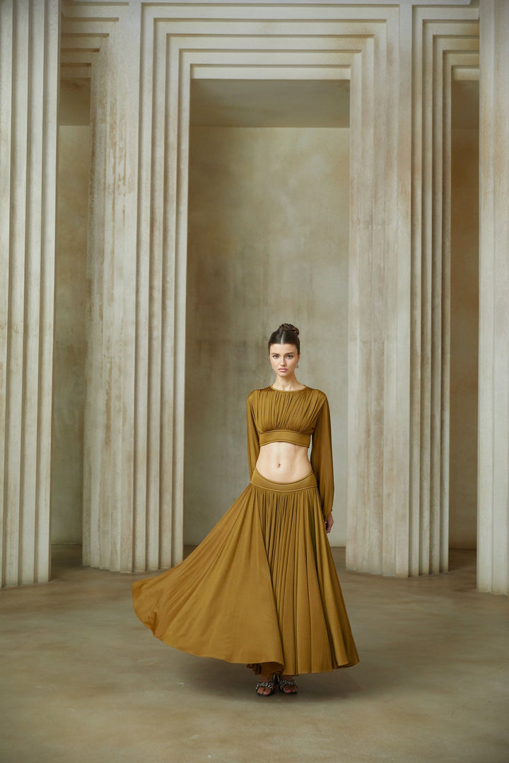 Daphné Green Fully Pleated Two-Piece Blouse and Skirt Set