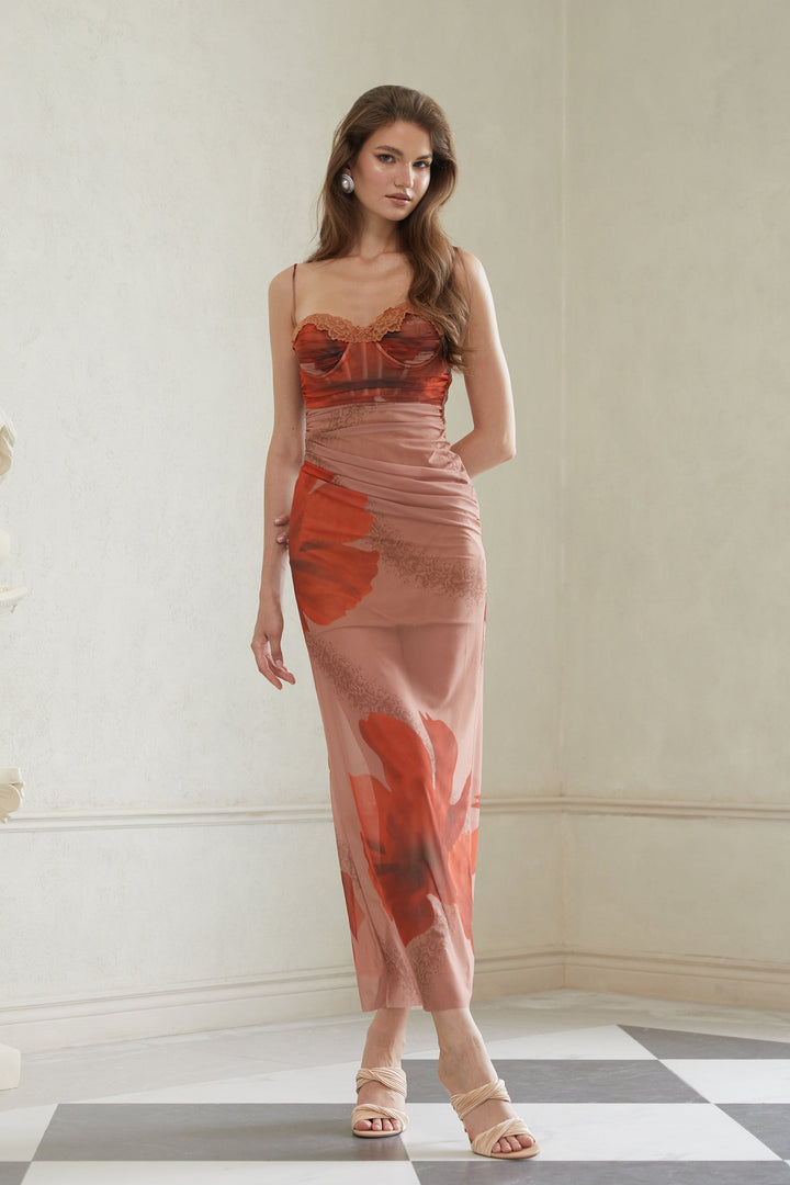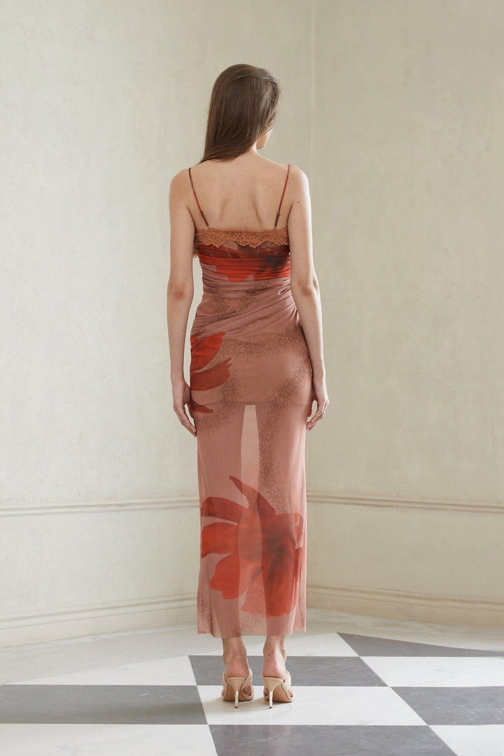Églantine Brown Floral Print Mesh Maxi Dress