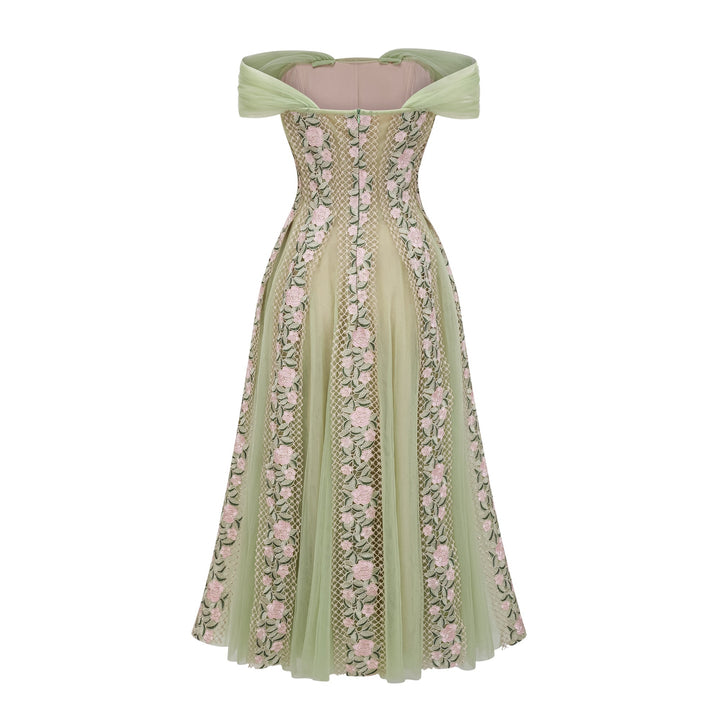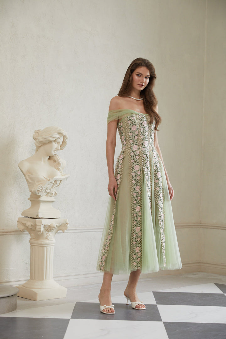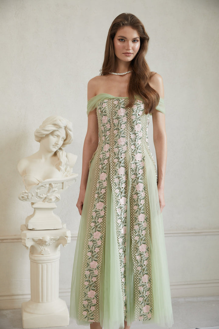 Eleni Green Tulle Panel Floral Midi Dress
