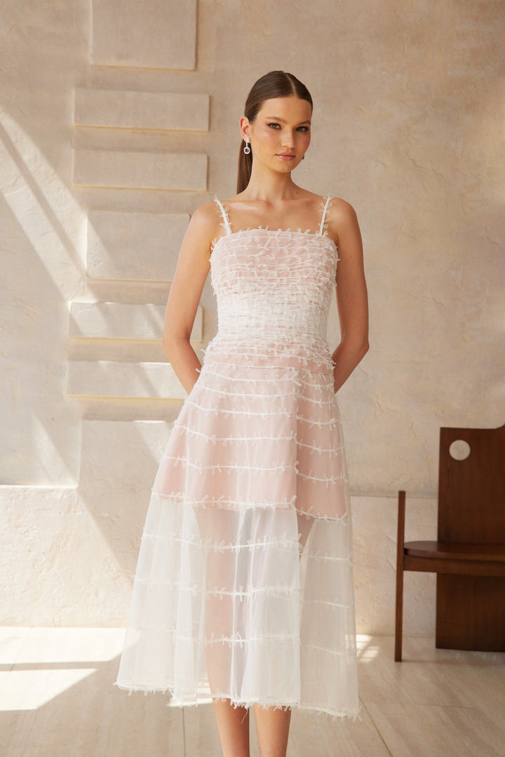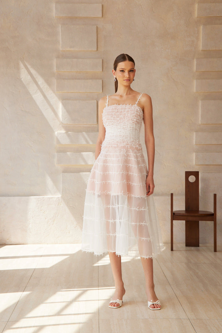 Eléonore White Creased Tulle Midi Dress