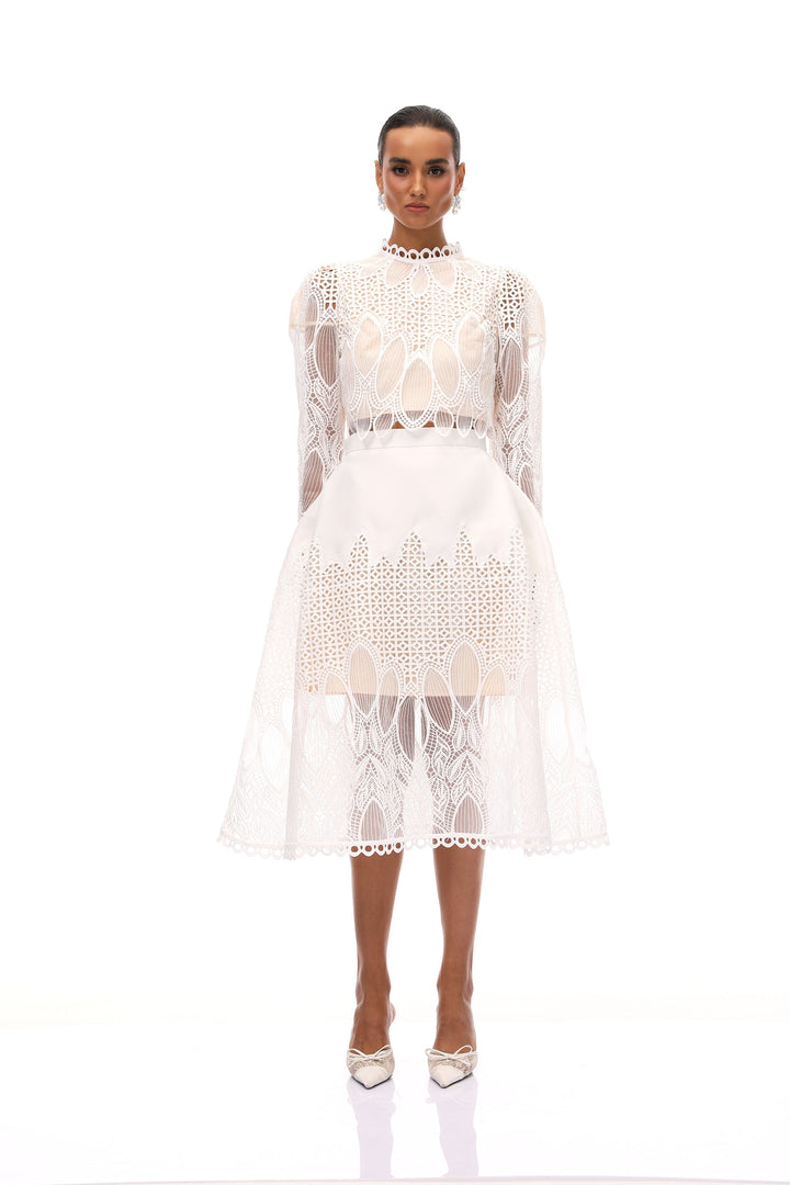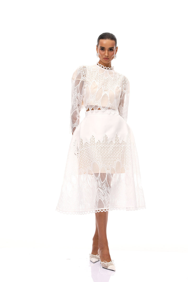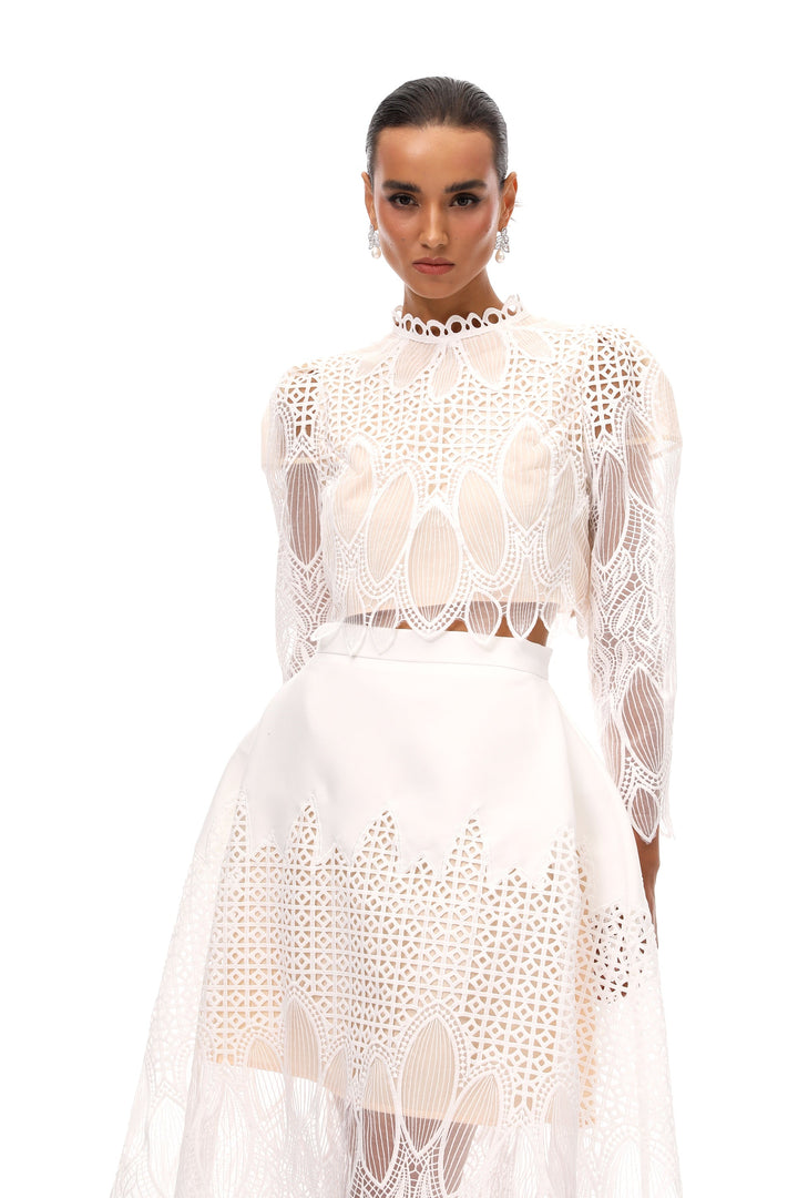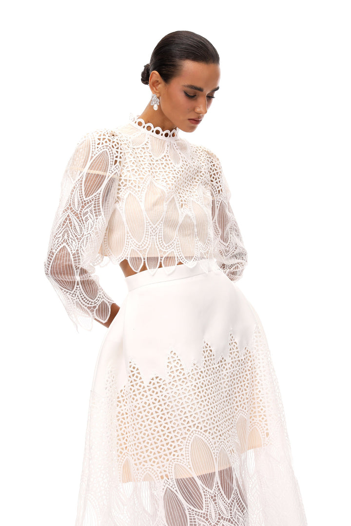 Anett White Corded Lace Blouse & Skirt Set