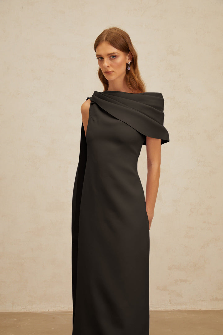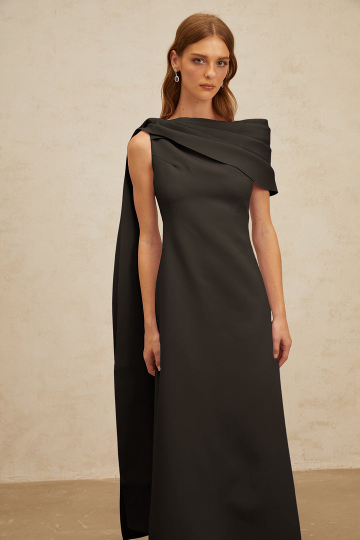 Annabelle Black Cape-Design Ribbon Maxi Dress
