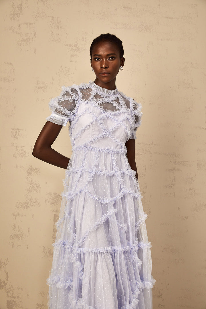 Annabelle Blue Polka Dot Ruffled Tulle Maxi Dress