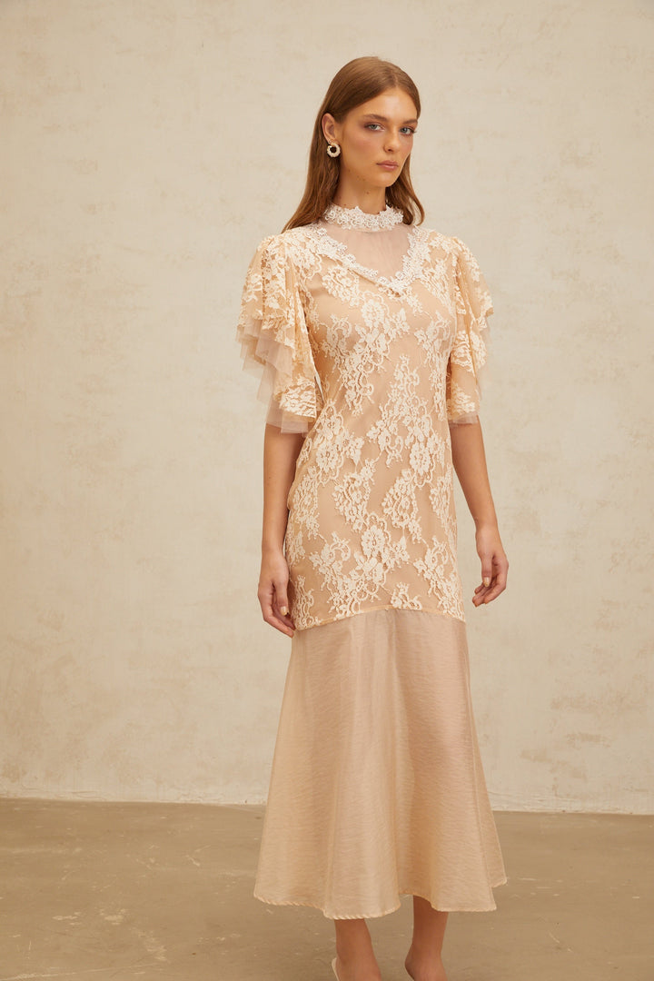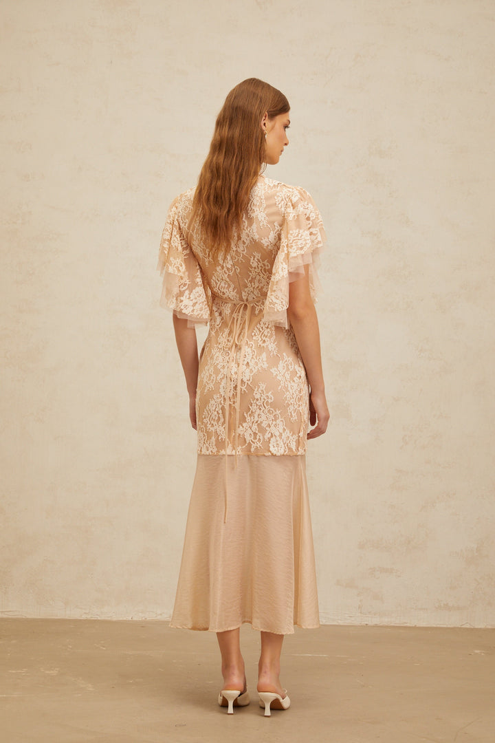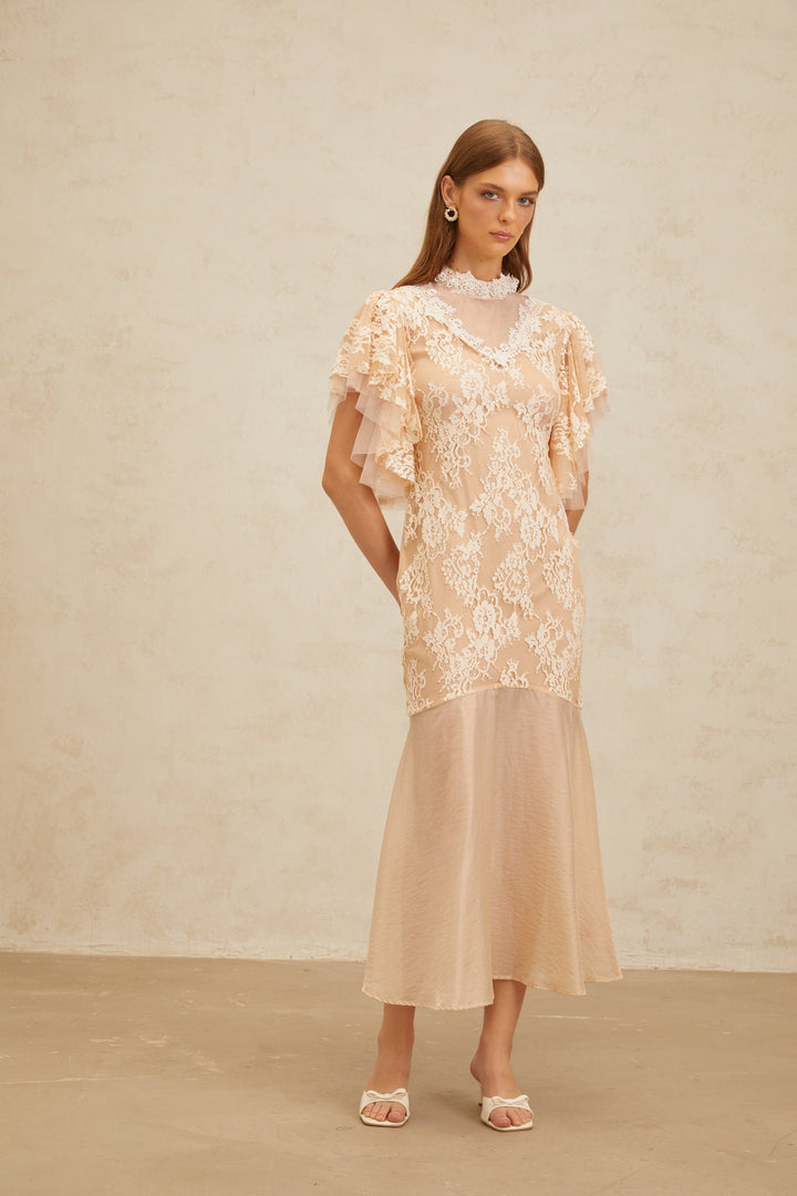 Annabelle Embellished Floral Lace Panelled Midi Dress in Neutrals