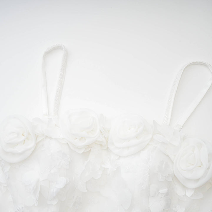 • Model is 1.78m, wearing size M • White • Sleeveless • Detachable straps • Off the shoulder • Layered design • Faux flower design • Rear zip fastening • Composition: 80% Polyester, 20% Cotton