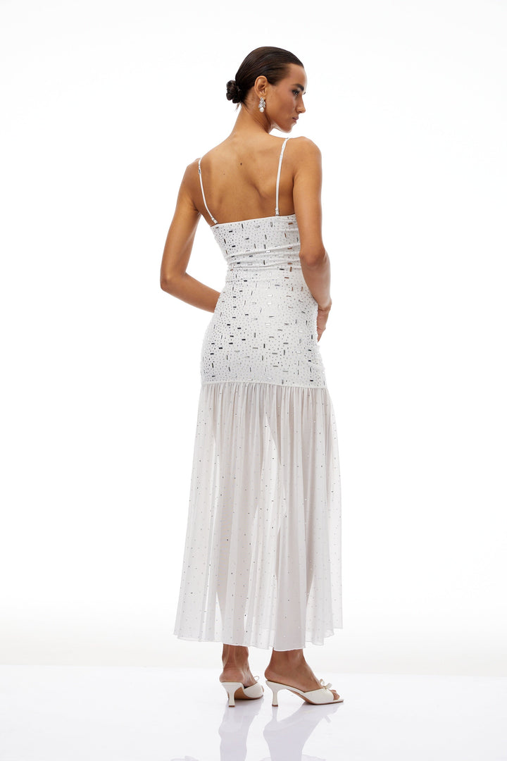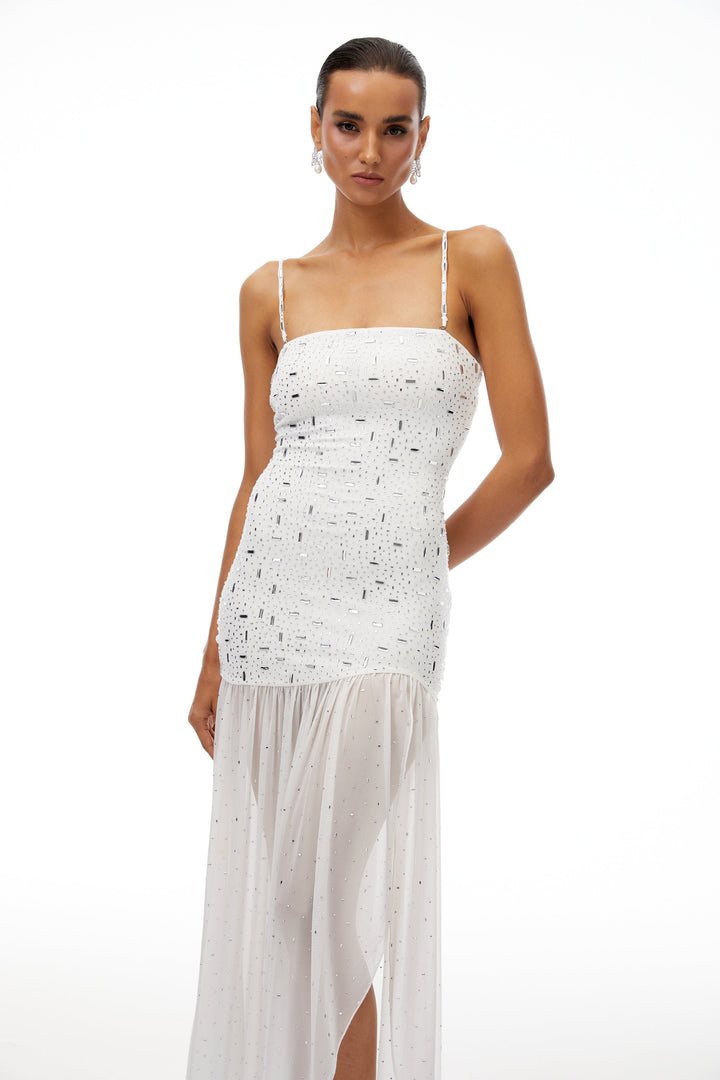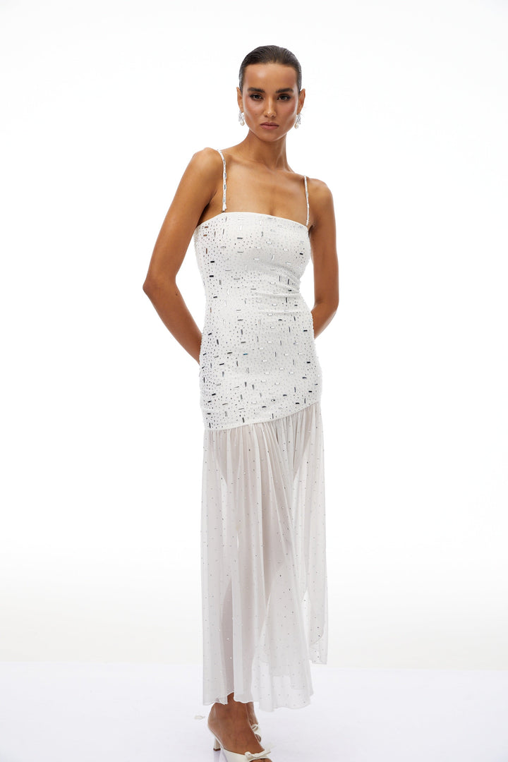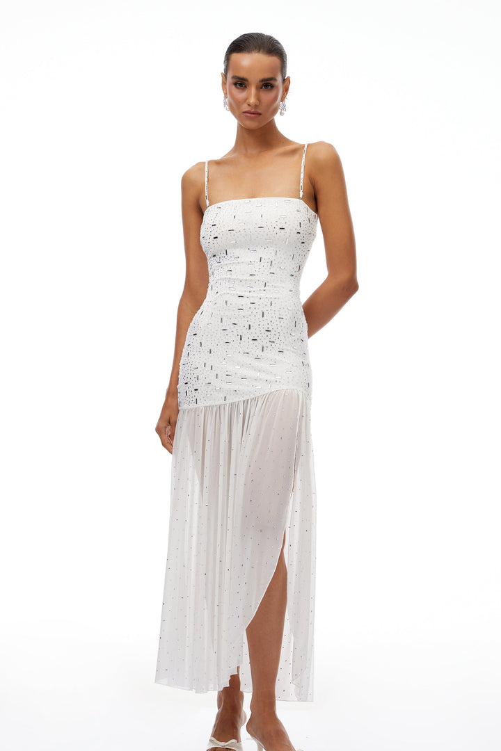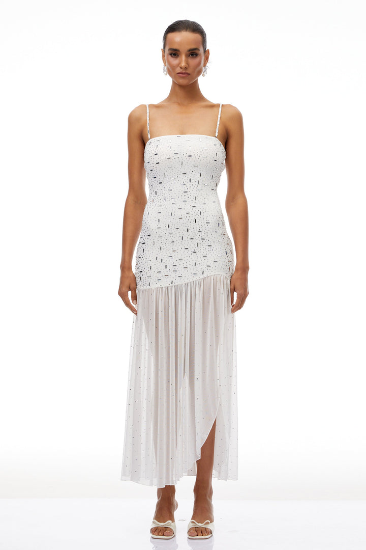 Apollonia White Rhinestone Asymmetrical Maxi Dress