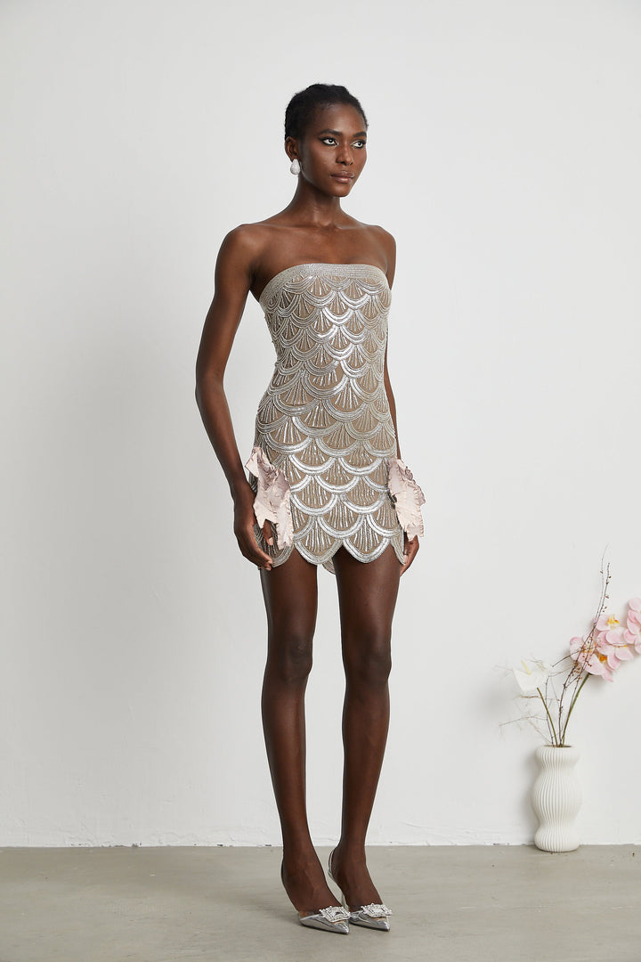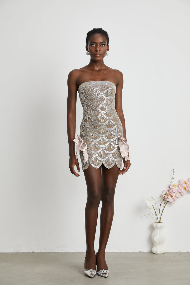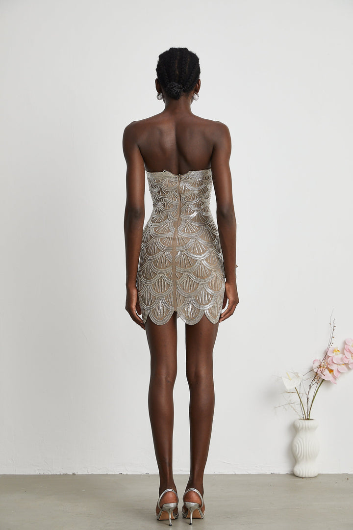 • Model is 1.77m, wearing size M • Brown & Silver • Off the shoulder • Bandage dress • Front bowknot detailing • Sequin embellished • Rear zip fastening • Mini length • Composition: 100% Polyester fiber