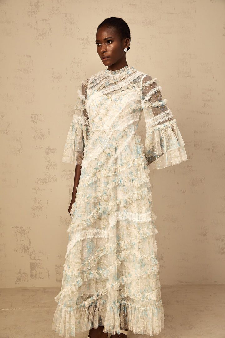 Aurianne Blue Floral Print Ruffled Tulle Maxi Dress
