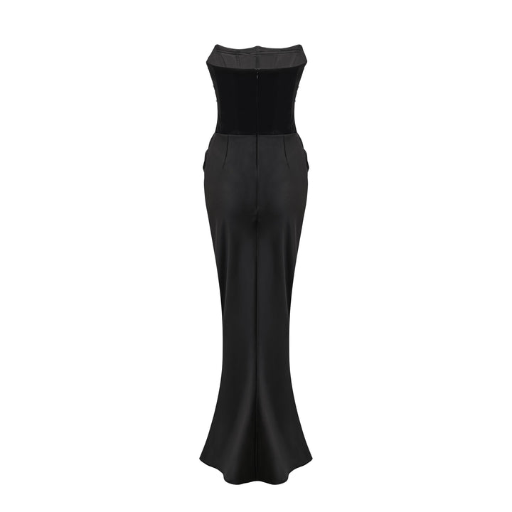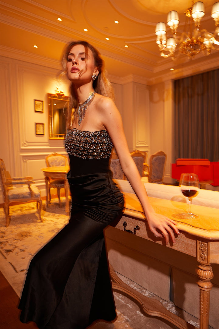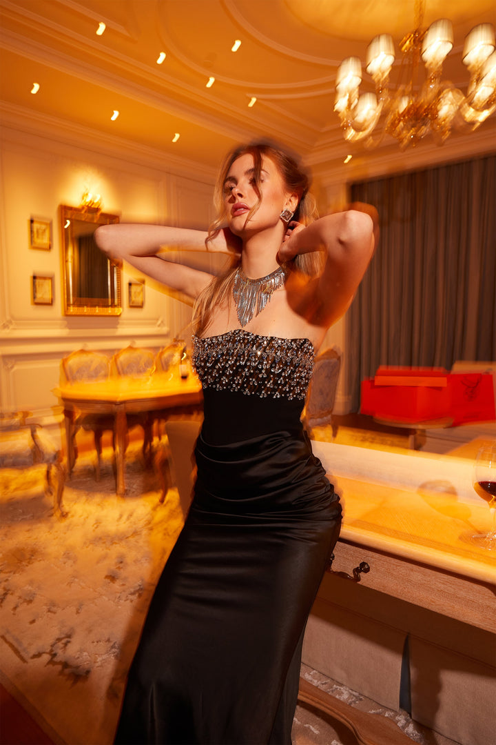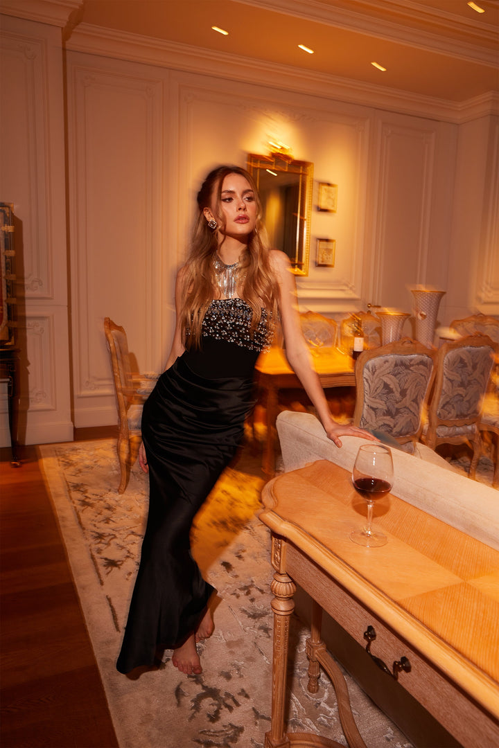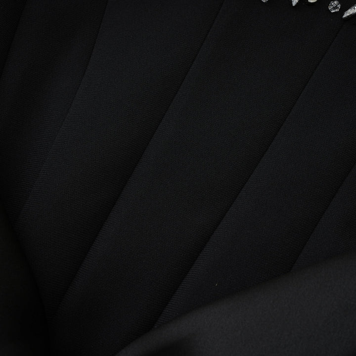 • Model is 1.75m, wearing size S • Black • Off the shoulder • Pleated • Crystal embellishment • Rear zip fastening • Flared hem • Maxi length • Composition: 100% Terylene fiber