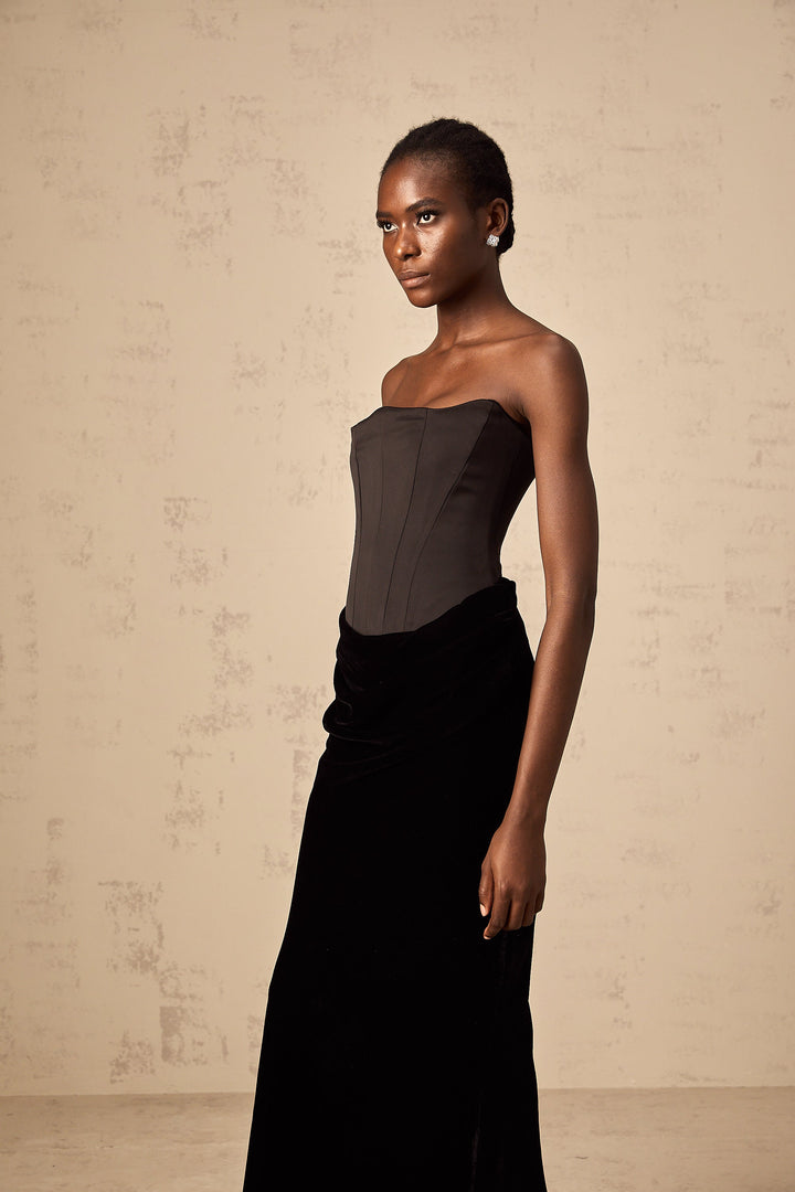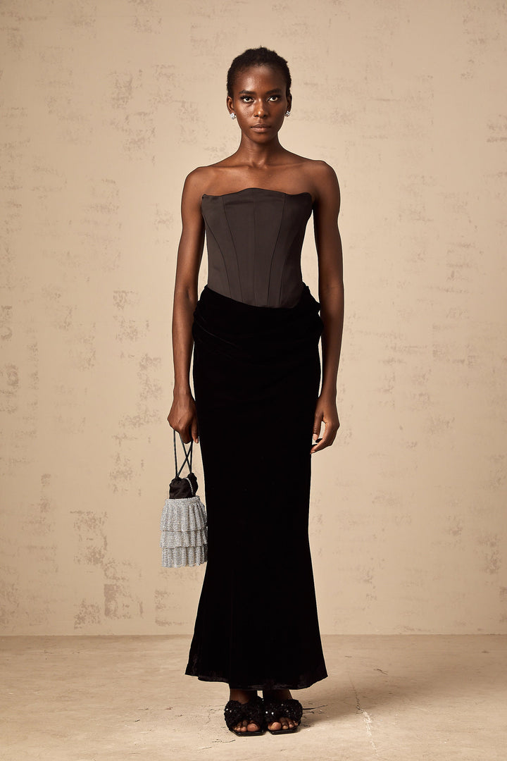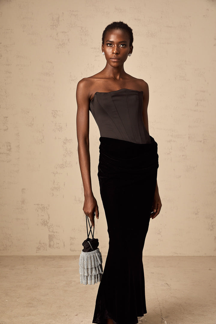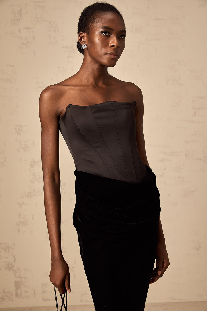 • Model is 1.77m, wearing size M • Black • Velvet • Satin panelling • Strapless • Corset style • Ruched detailing • Draped detailing • Flared hem • Rear zip fastening • Maxi length • Composition: 97% Terylene fiber, 3% Elastane • NOTICE: This item is a Final Sale item, offered at an extremely low discount. Therefore, we do not accept any returns, exchanges, refunds. Please make sure to confirm the size and your needs before placing the order. Thank you for your understanding!
