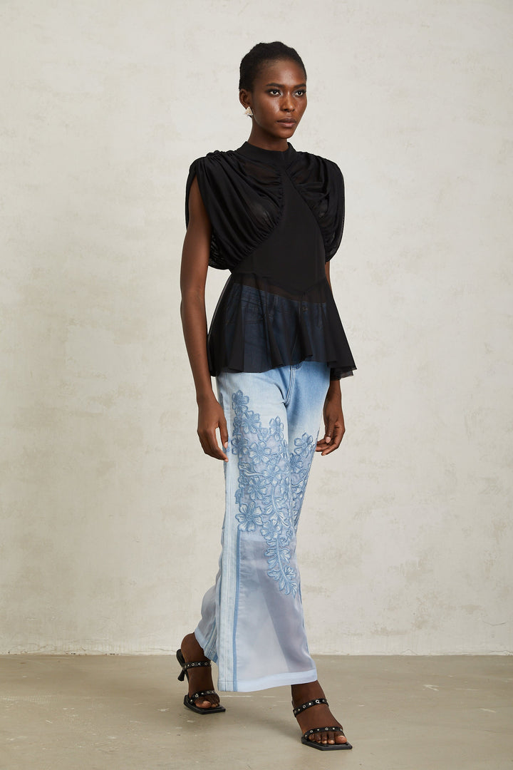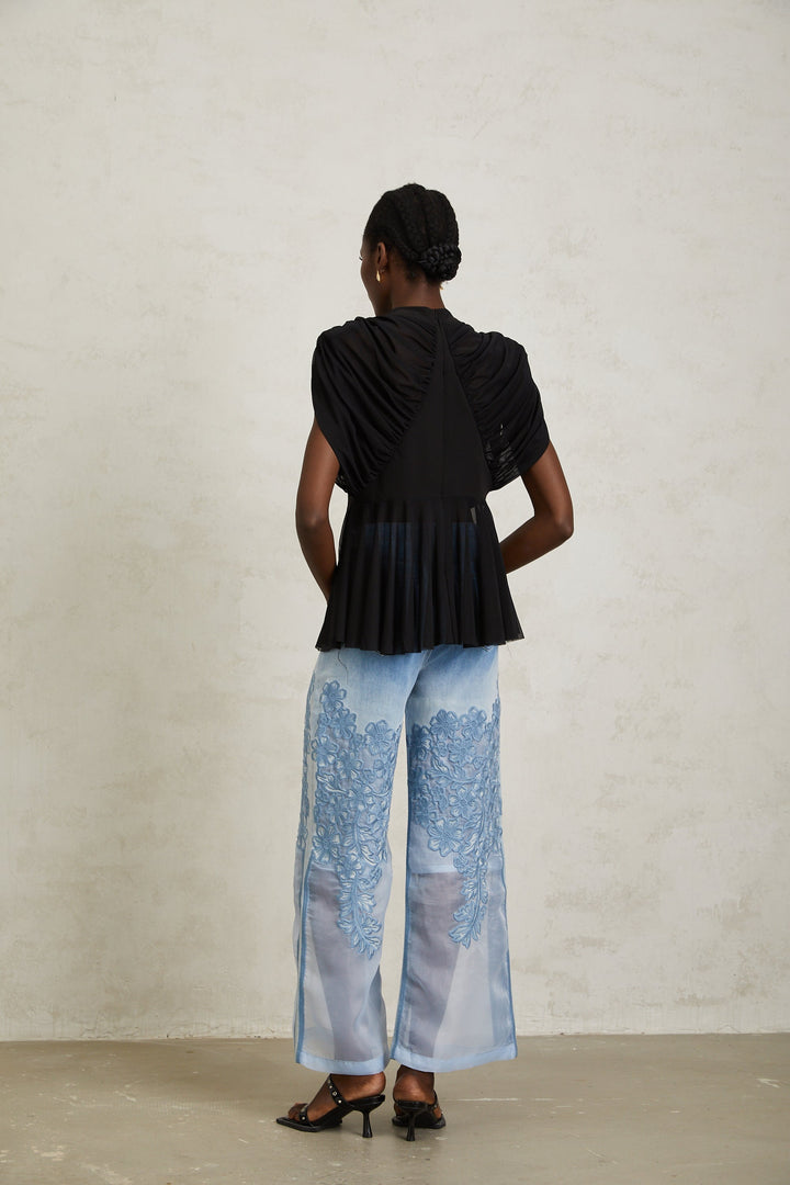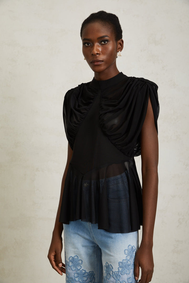 • Model is 1.77m, wearing size M • Black • Crew neck • Cap sleeves • Peplum waist • Semi-sheer construction • Mesh • Ruched detailing • Pleated detailing • Rear zip fastening • Composition: 95% Terylene fiber, 5% Spandex • NOTICE: This top may have slight sheerness depending on lighting and styling. For optimal wear, we recommend pairing it with a skin-toned undergarment or slip for added coverage while maintaining the intended flow and silhouette.