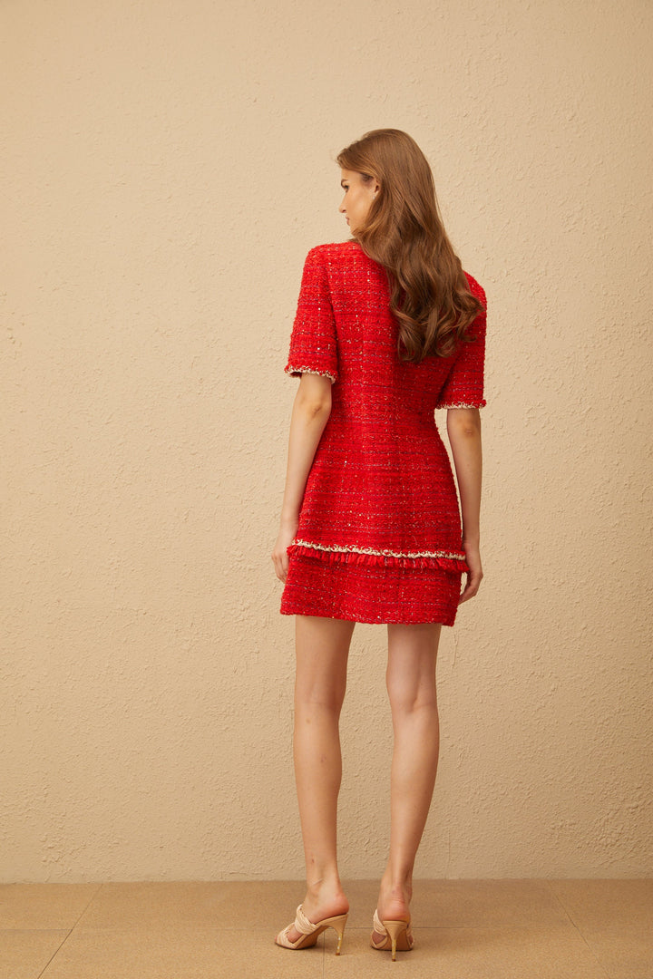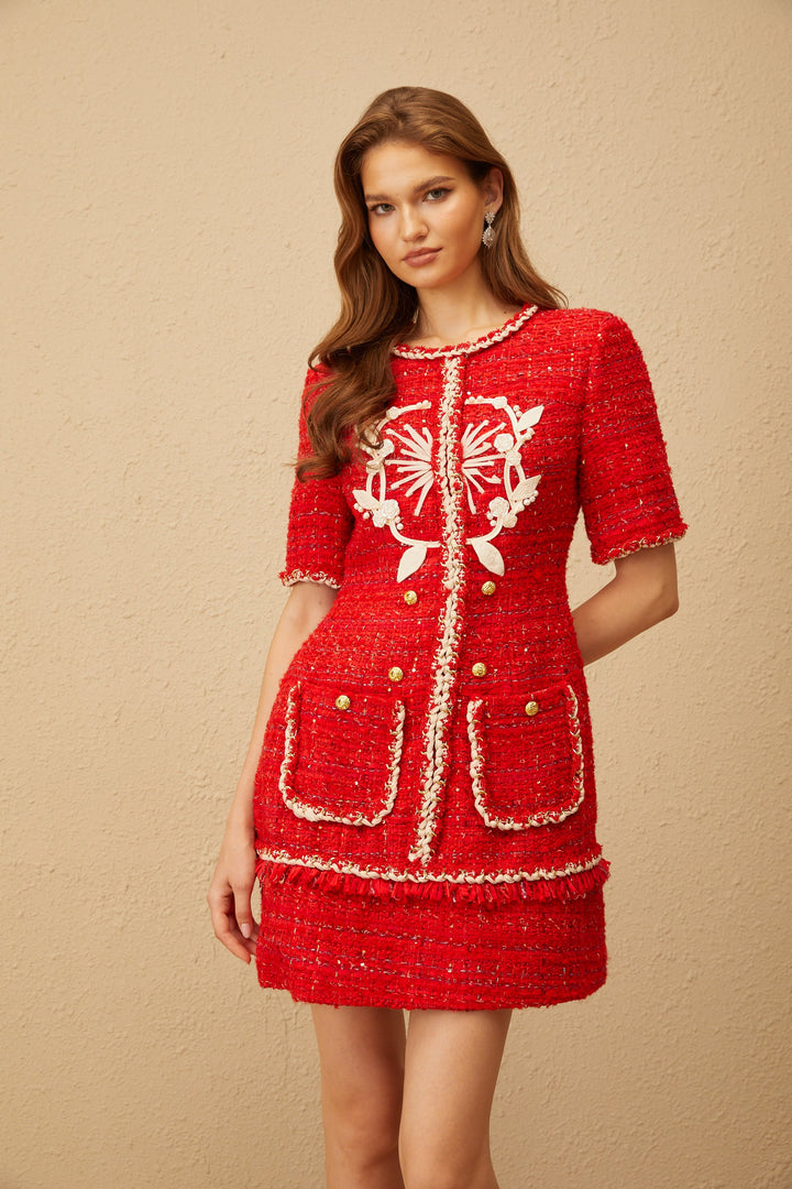 • Model is 1.78m, wearing size S • Red • Round neck • Short sleeves • Fitted waistline • Tweed • Floral appliqué • Braid detailing • Embossed gold-tone buttons • Metallic threading • A-line skirt • Two front patch pockets • Rear zip fastening • Mini length • Composition: 65% Terylene fiber, 20% Cotton,15% Spandex