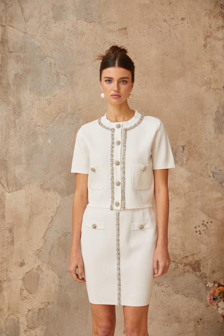 Top: • Model is 1.75m, wearing size M • White • Round neck • Short sleeves • Knitted construction • Crystal embellishment • Ribbed hem • Two chest patch pockets • Front button fastening • Composition: 65% Viscose, 35% Nylon Skirt: • Model is 1.75m, wearing size M • White • High rise • Knitted construction • Crystal embellishment • Straight hem • Faux pocket detailing • Elasticated waistband • Thigh length • Composition: 65% Viscose, 35% Nylon