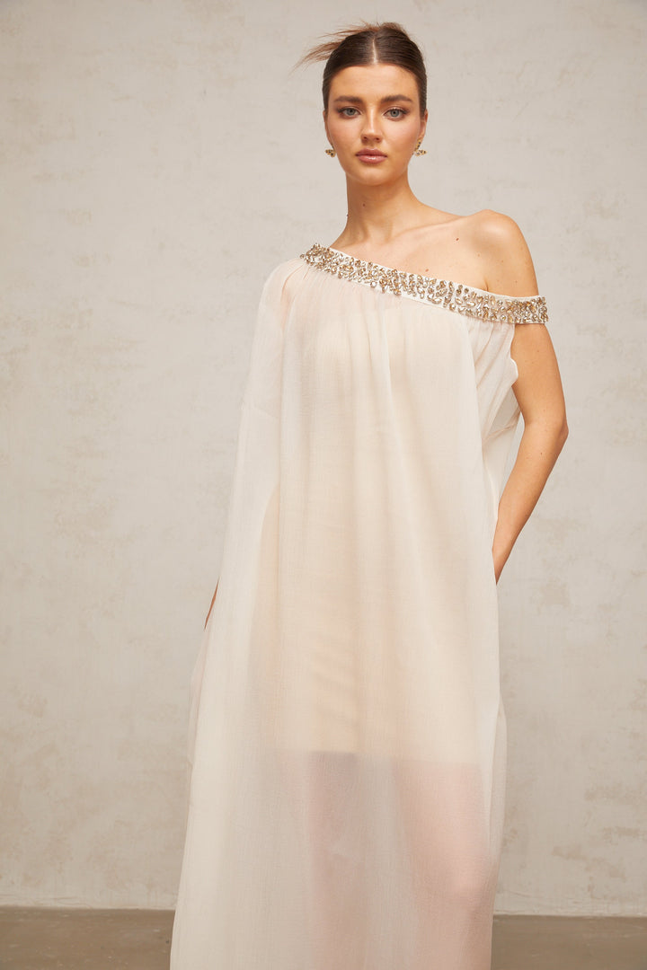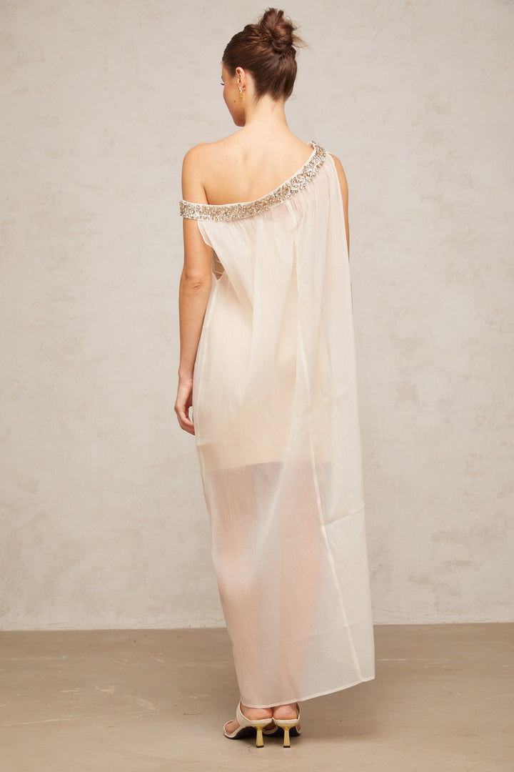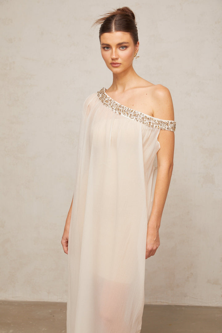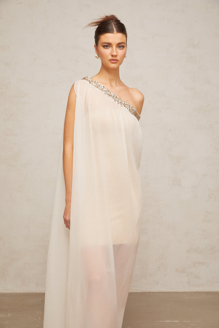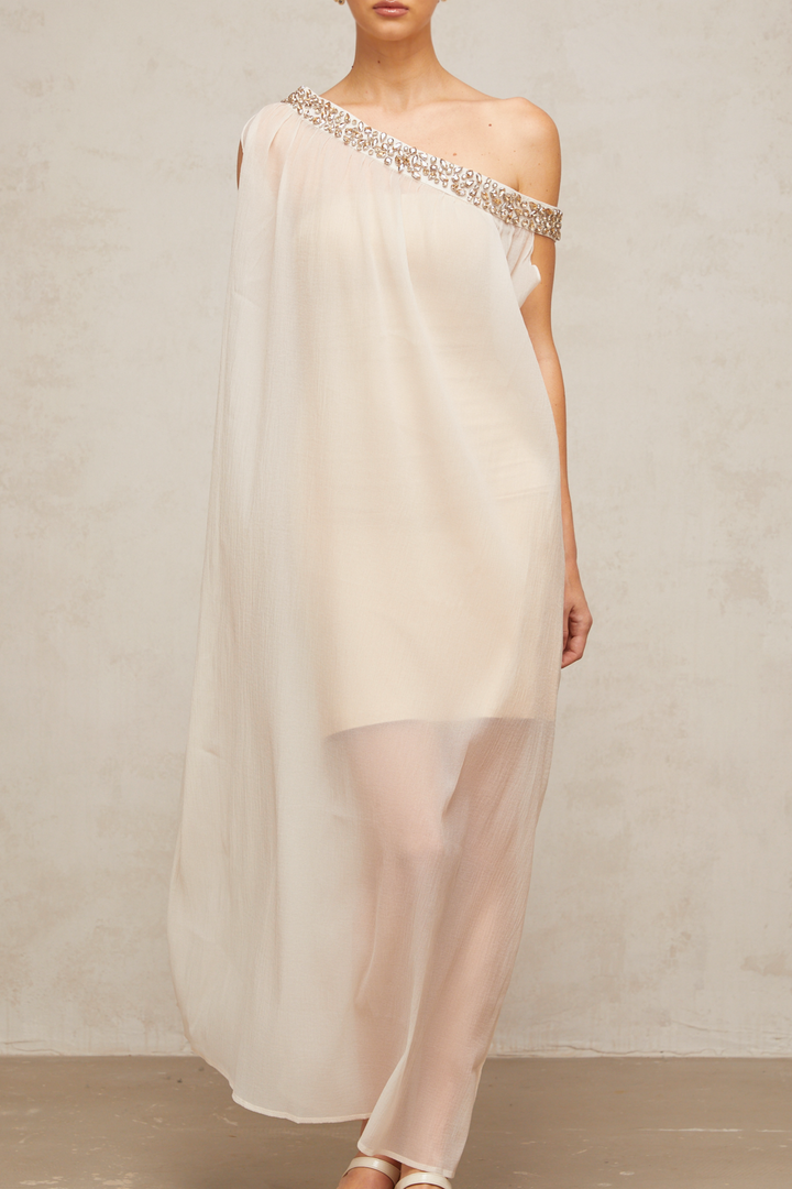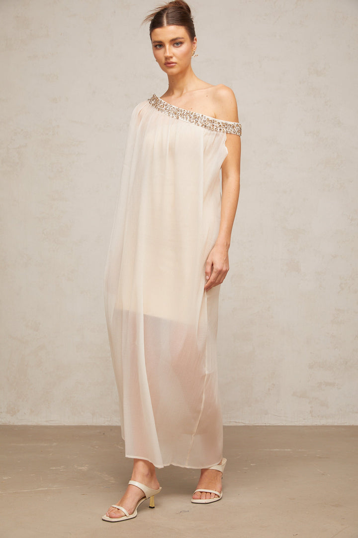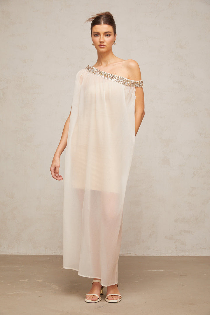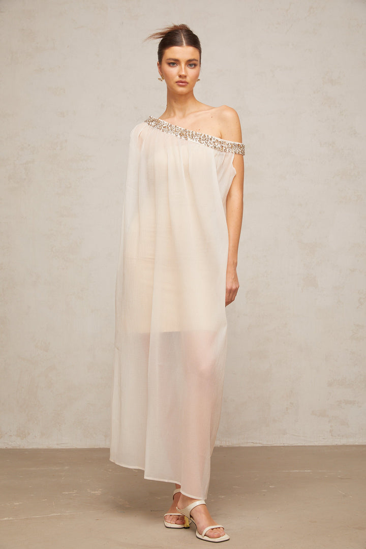 • Model is 1.75m, wearing size M • Neutrals • Sleeveless • Mono shoulder • Pleated detailing • Crystal embellishment • Ankle length • Composition: 100% Terylene fiber