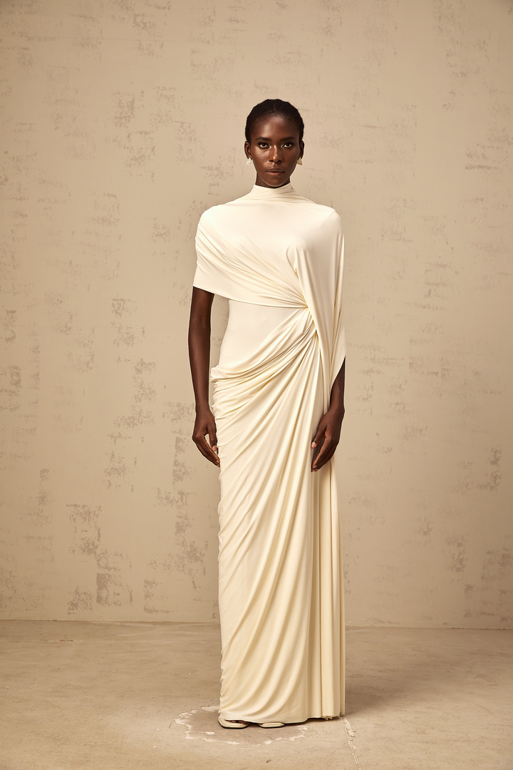 Cape: • Model is 1.77m, wearing size M • Off-White • Mock neck • Asymmetrical design • Gathered detailing • Stretch design • Composition: 97% Terylene fiber, 3% Elastane Dress: • Model is 1.77m, wearing size M • Off-White • Mock neck • Shorts sleeves • Fitted silhouette • Stretch design • Gathered detailing • Draped detailing • Maxi length • Composition: 97% Terylene fiber, 3% Elastane