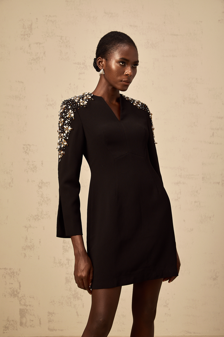 Béatrice black split-neck embellished mini dress