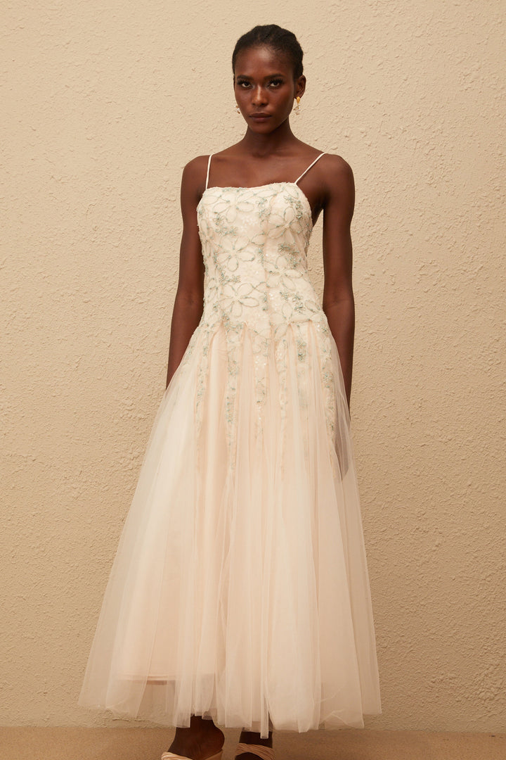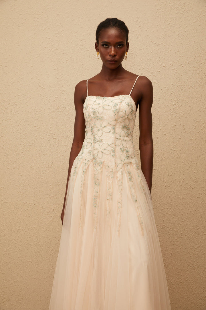Madeline Green Floral Embroidered Tulle Maxi Dress