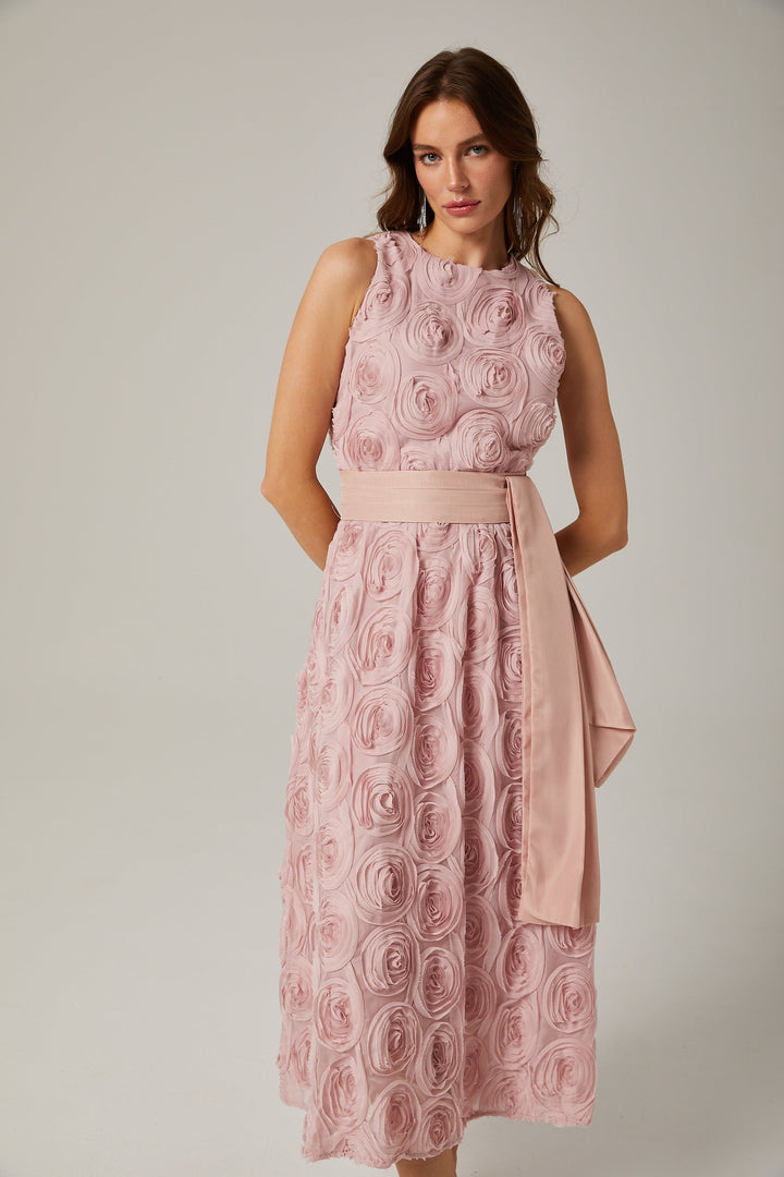 • Model is 1.78m, wearing size M • Pink • Round neck • Sleeveless • Faux-floral embellishment • Waist tightened design • Two side inset pockets • Rear zip fastening • Midi length • Composition: 90% Polyester, 10% Spandex