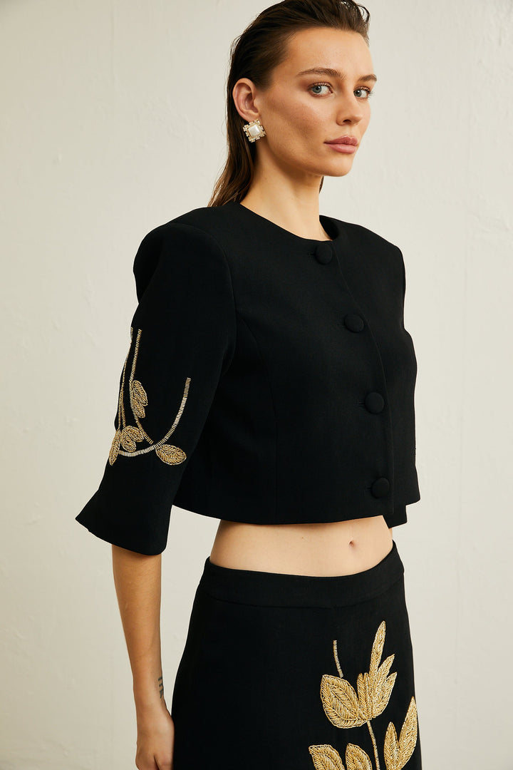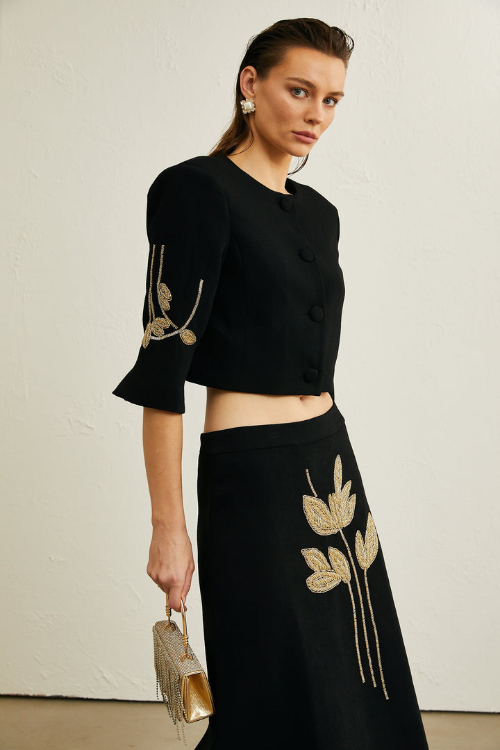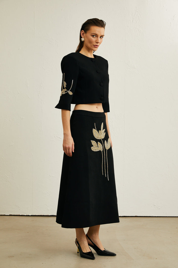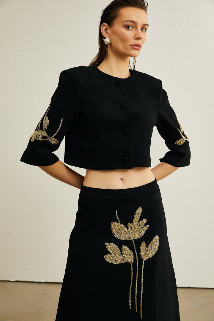 Jacket: • Model is 1.78m, wearing size M • Black • Round neck • Three-quarter sleeves • Floral appliqué • Front button fastening • Cropped • Composition: 56% Cotton, 44% Polyester Skirt: • Model is 1.78m, wearing size M • Black • Floral appliqué • Rear zip fastening • Midi length • Composition: 56% Cotton, 44% Polyester