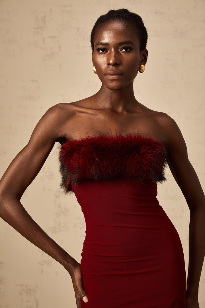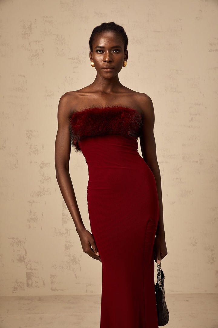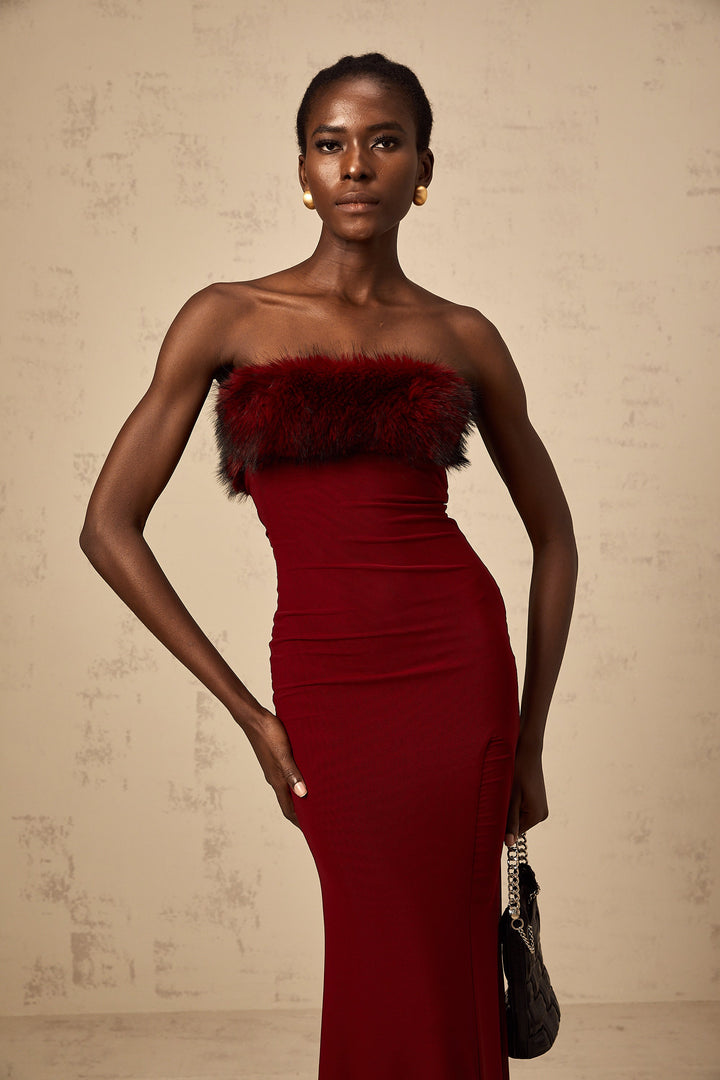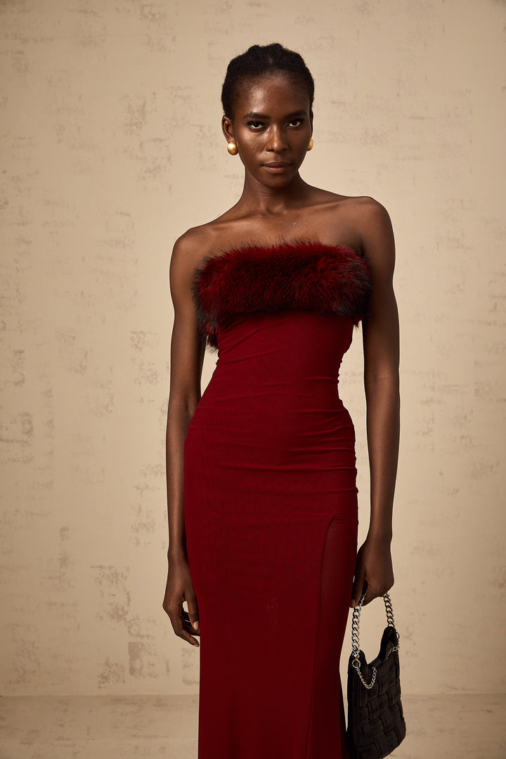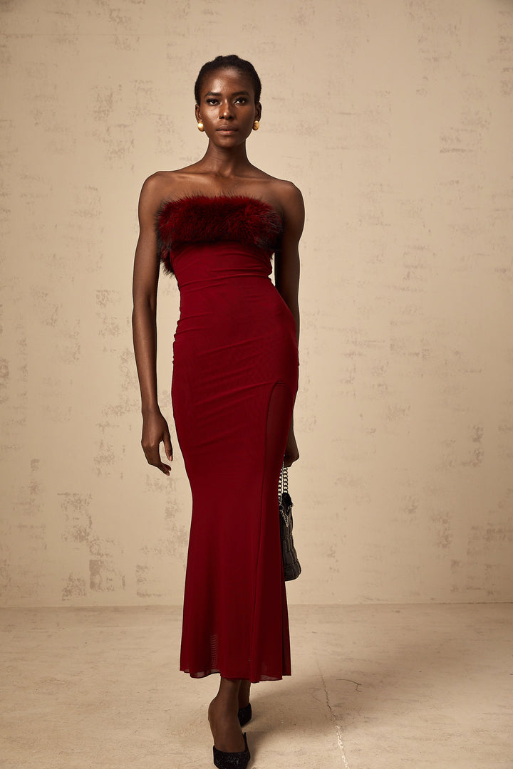 • Model is 1.77m, wearing size M • Red • Mesh design • Sleeveless • Off the shoulder • Semi-sheer construction • Faux-fur design • Layered design • Fitted silhouette • Ankle length • Composition: 95% Polyamide, 5% Spandex