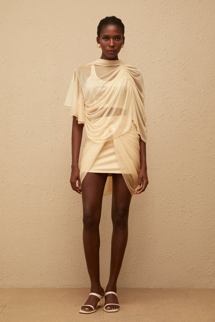 Top: • Model is 1.77m, wearing size M • Neutrals • Crew neck • Batwing Sleeves • Open back • Tulle • 3D-petal detailing • Cropped • Composition: 100% Terylene fiber Skirt: • Model is 1.77m, wearing size M • Neutrals • Tulle • Ruched detailing • Rear zip fastening • Mini length • Composition: 100% Terylene fiber