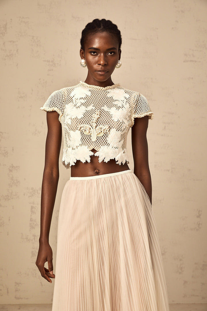 Top: • Model is 1.77m, wearing size M • Neutrals & White • Round neck • Cap sleeves • Floral appliqué • Crochet knit • Cropped • Rear zip fastening • Composition: 100% Terylene fiber Skirt: • Model is 1.77m, wearing size M • Neutrals • Tulle • Fully pleated • Scallop hem • Rear zip fastening • Calf length • Composition: 100% Terylene fiber