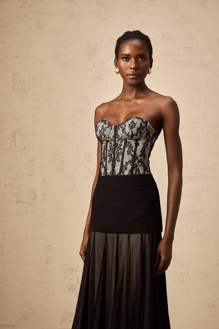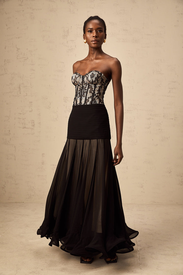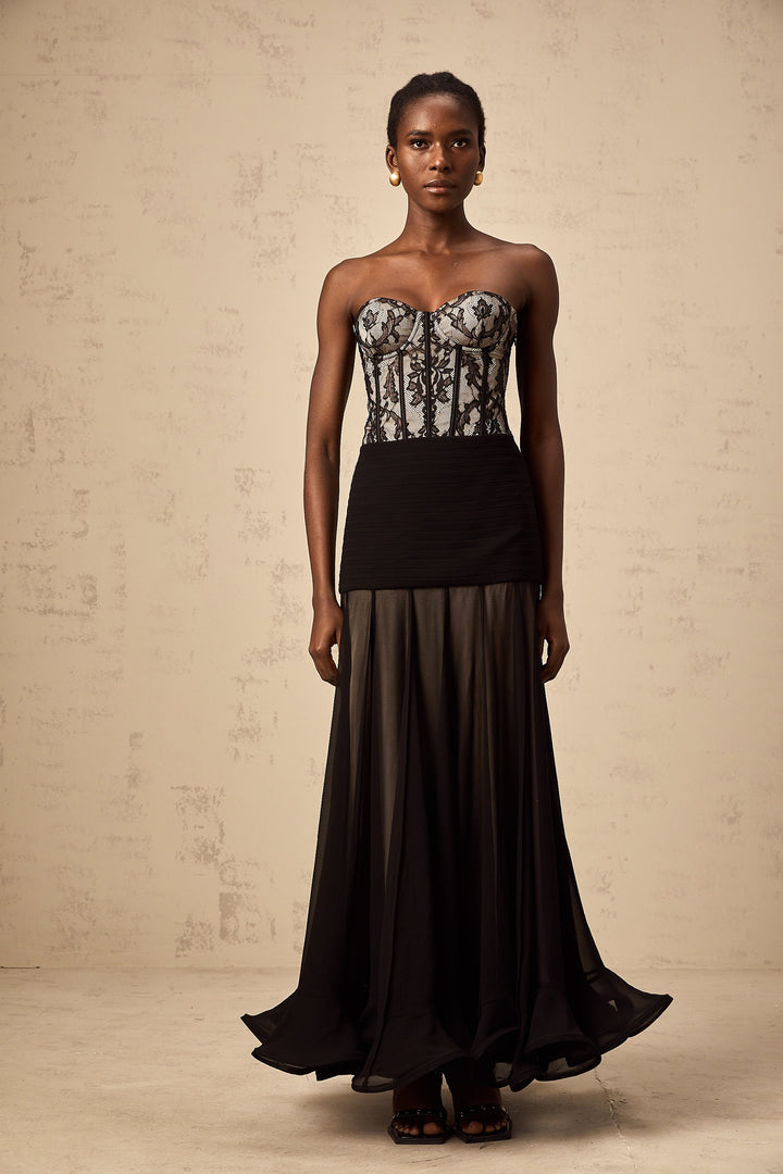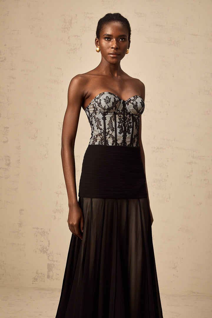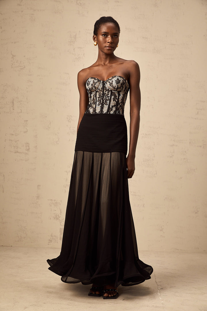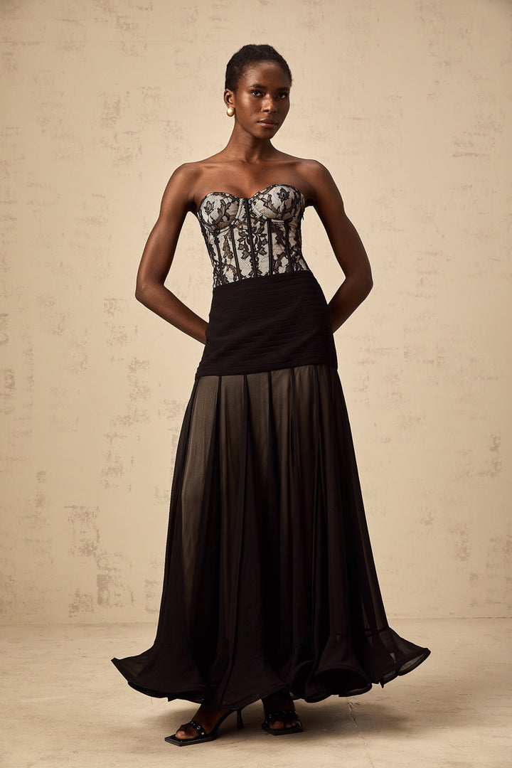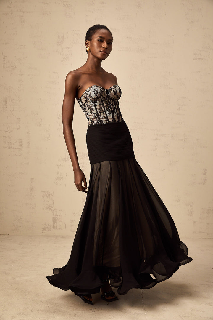 • Model is 1.77m, wearing size M • Black • Corset style • Lace overlay • Tulle skirt • Ruched detailing • Pleated detailing • Flounce hem • Floor length • Composition: 70% Rayon, 24% Cotton, 6% Silk