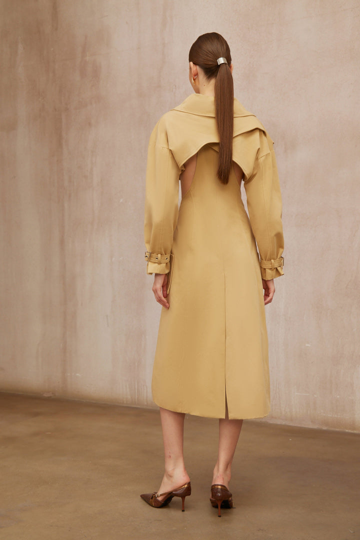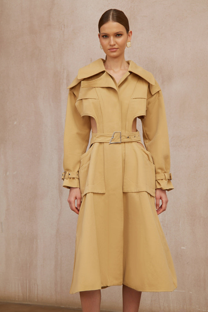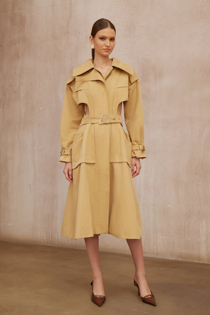 Pilar Neutral Cut Out Belted Long Trench Coat