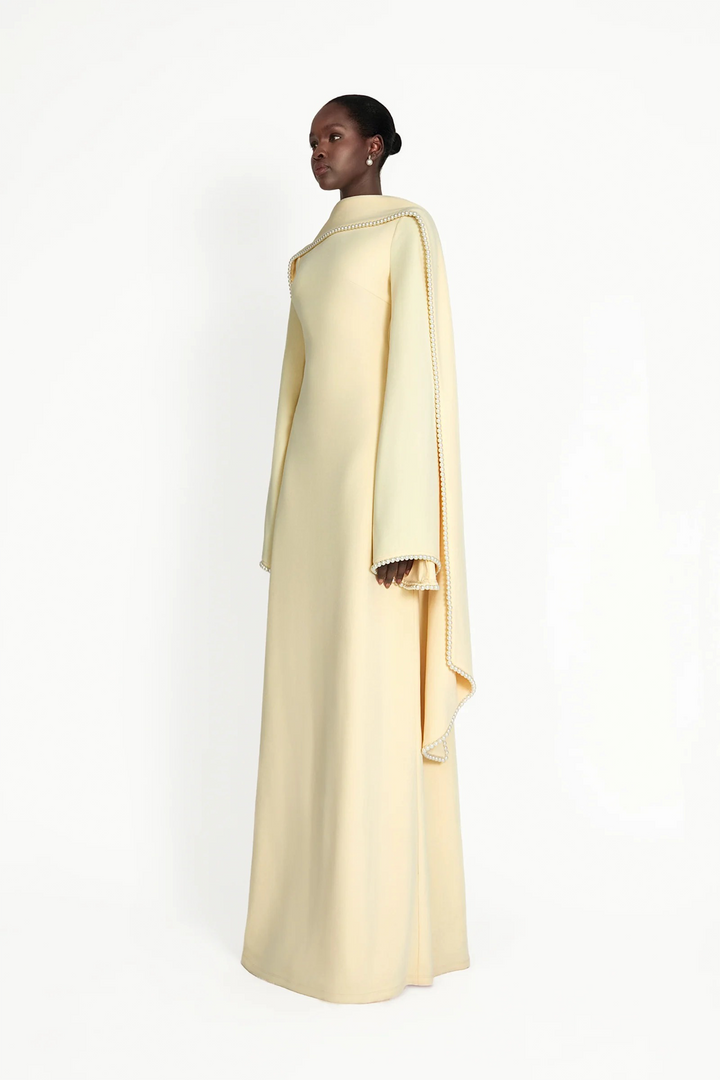 Piroska Yellow Pearl Trim Shawl Detail Maxi Dress