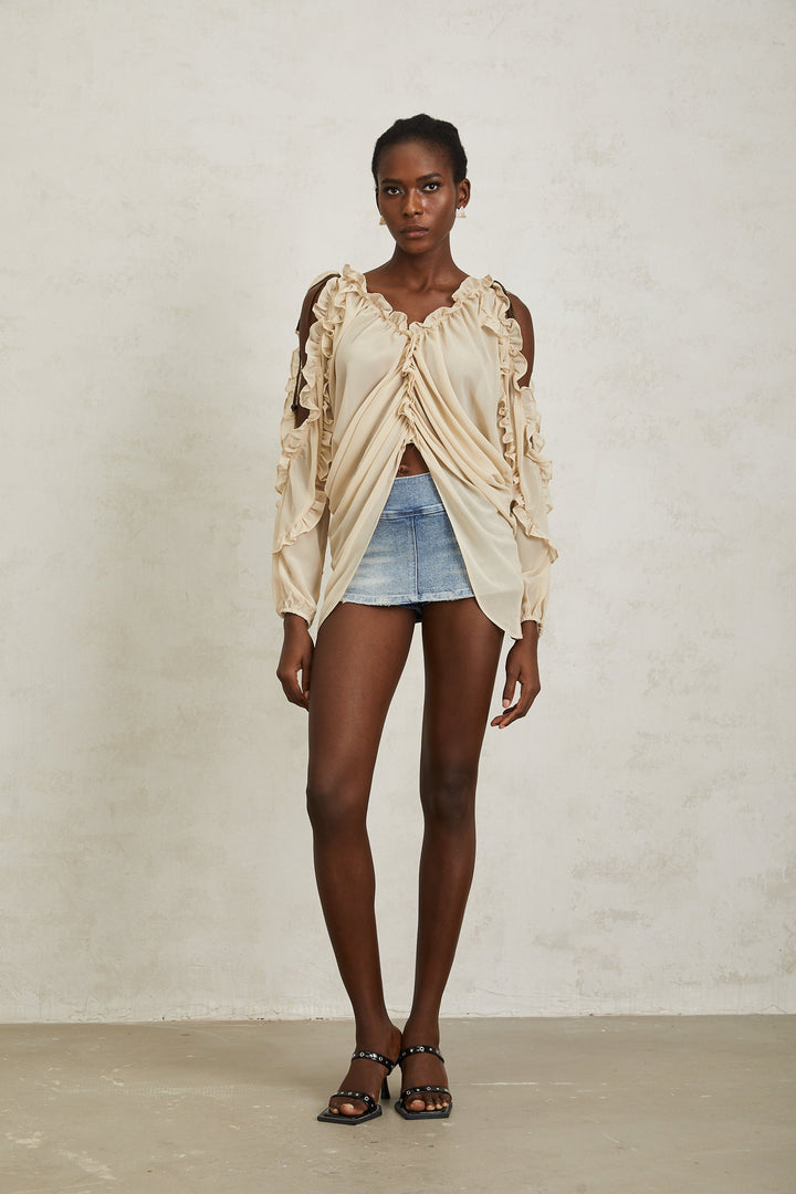 Priscille Neutral Ruffled Trim Chiffon Blouse